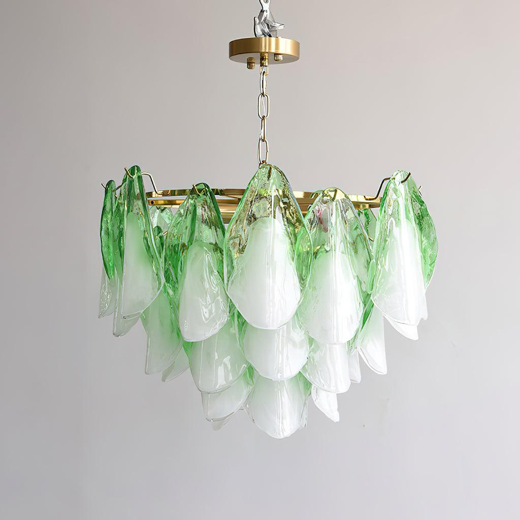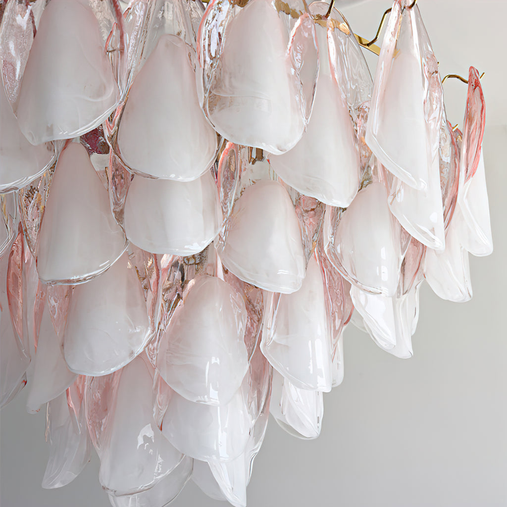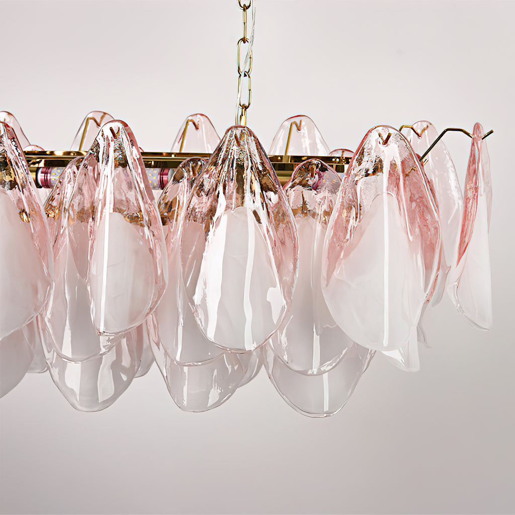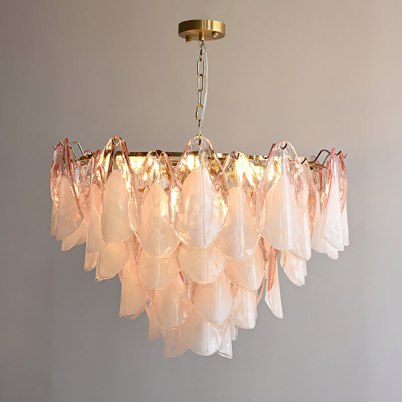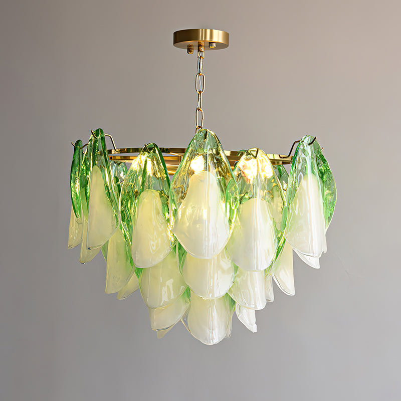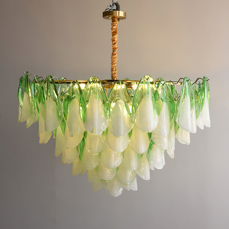 The Fuchsia Petal Chandelier celebrates the poetic rhythm of nature through cascading glass petals tinted in delicate shades of green, pink. Each hand-shaped piece captures the soft translucency of blooming flora, suspended from a iron frame that adds a refined contrast. With its luminous layering and fluid form, this chandelier creates an ethereal presence, ideal for transforming dining rooms, lounges, or artistic interiors into spaces of warmth, movement, and modern botanical elegance.