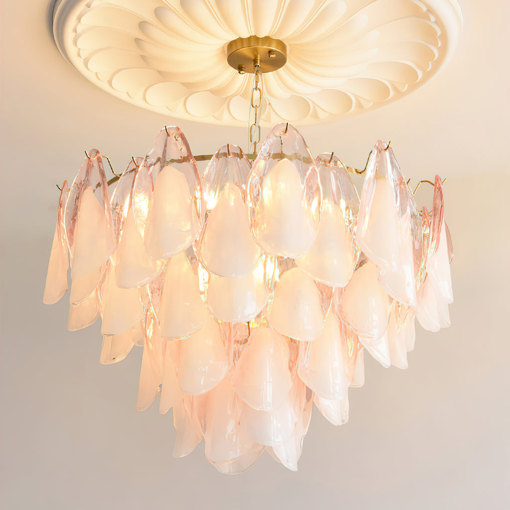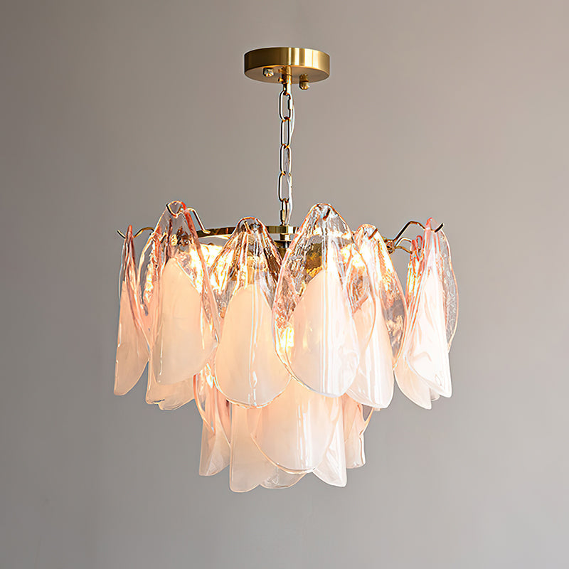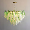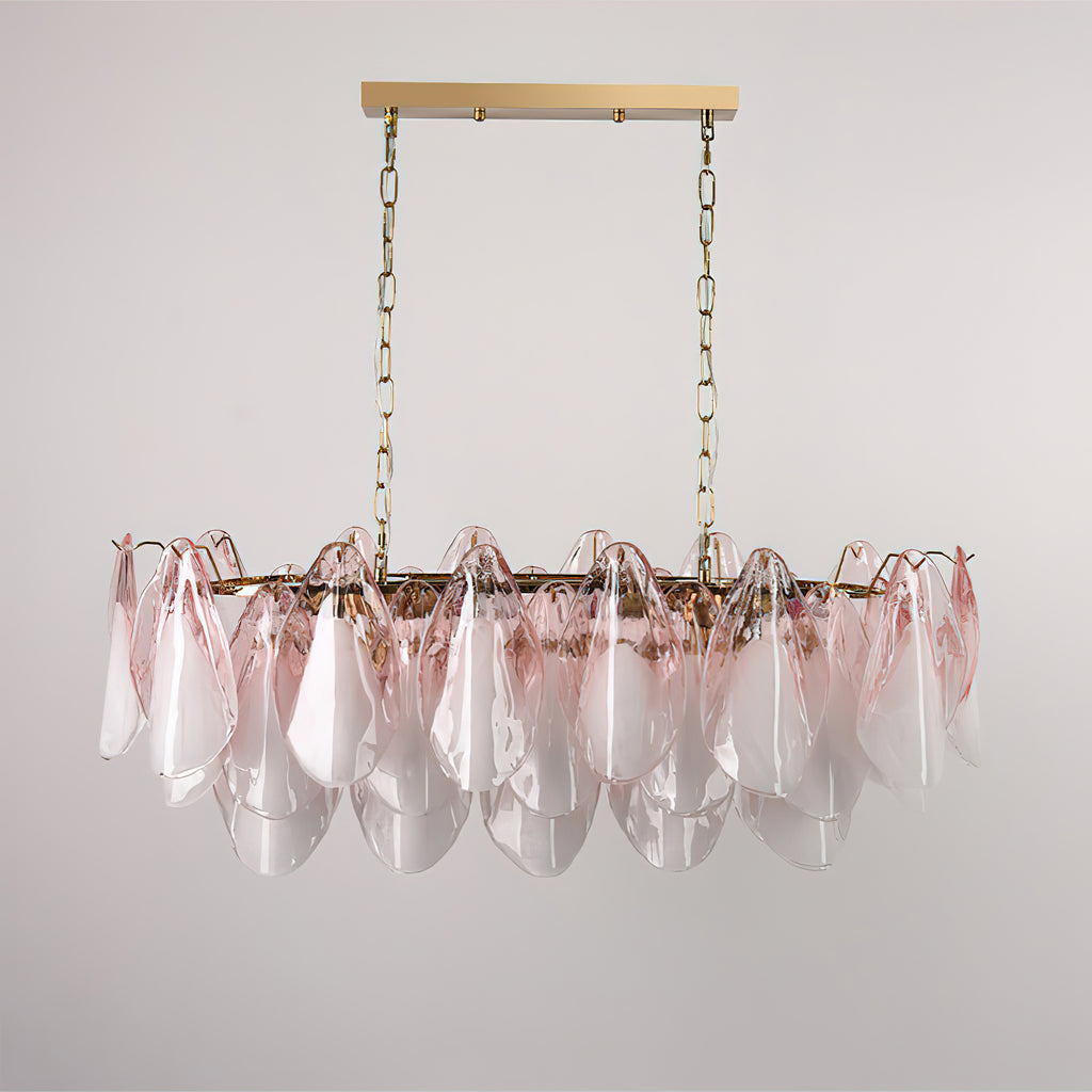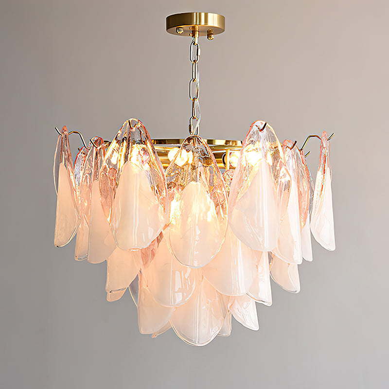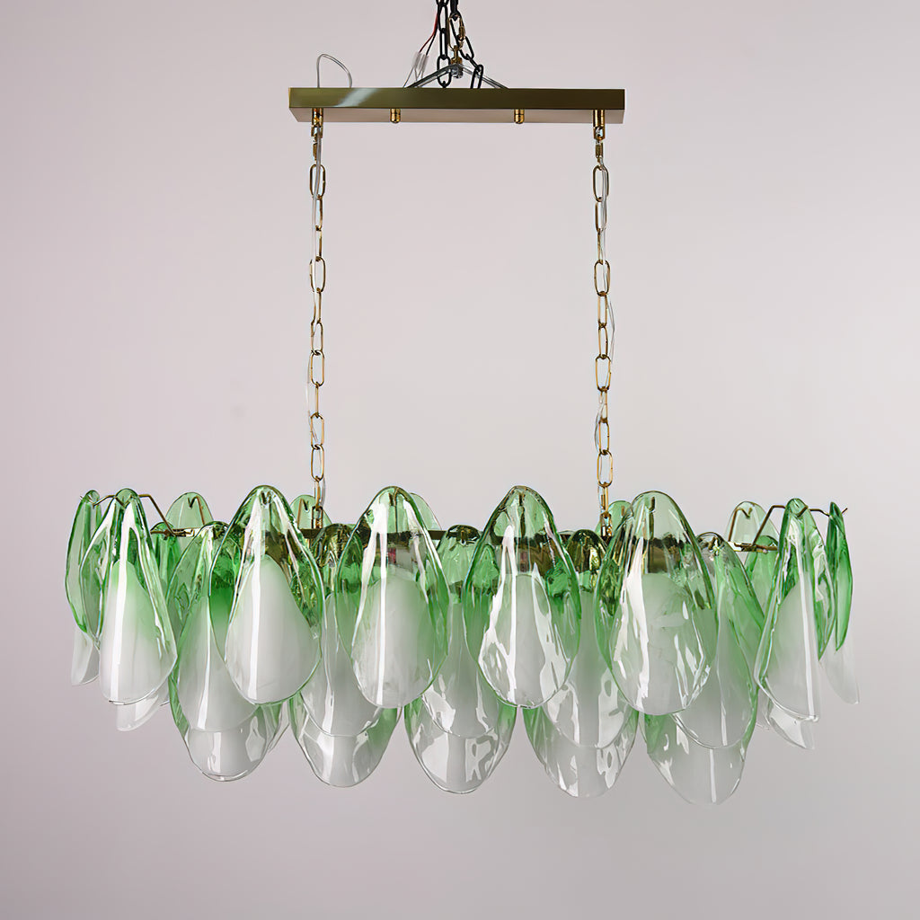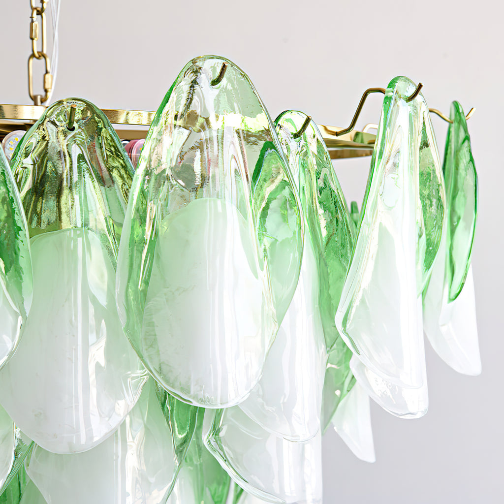 The Fuchsia Petal Chandelier celebrates the poetic rhythm of nature through cascading glass petals tinted in delicate shades of green, pink. Each hand-shaped piece captures the soft translucency of blooming flora, suspended from a iron frame that adds a refined contrast. With its luminous layering and fluid form, this chandelier creates an ethereal presence, ideal for transforming dining rooms, lounges, or artistic interiors into spaces of warmth, movement, and modern botanical elegance.