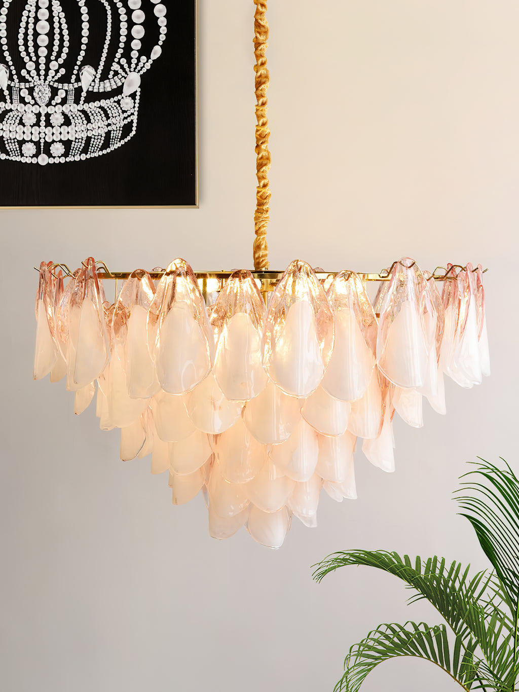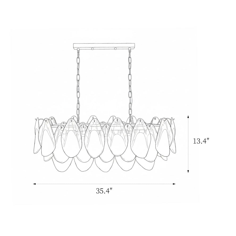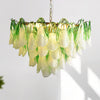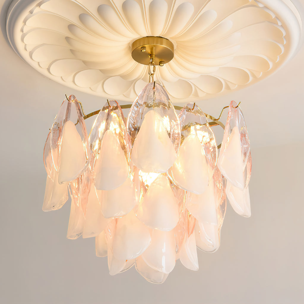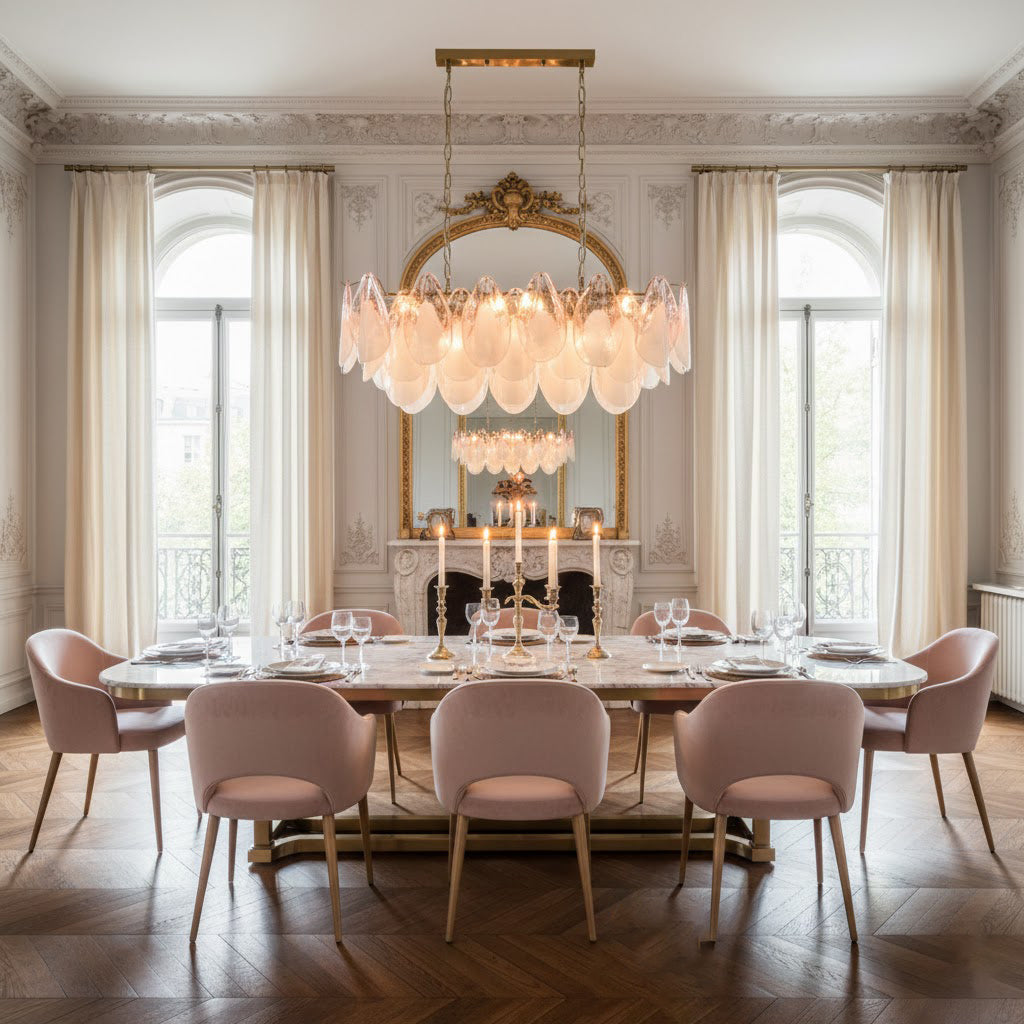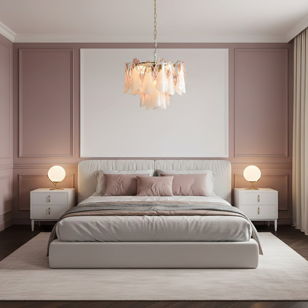 The Fuchsia Petal Chandelier celebrates the poetic rhythm of nature through cascading glass petals tinted in delicate shades of green, pink. Each hand-shaped piece captures the soft translucency of blooming flora, suspended from a iron frame that adds a refined contrast. With its luminous layering and fluid form, this chandelier creates an ethereal presence, ideal for transforming dining rooms, lounges, or artistic interiors into spaces of warmth, movement, and modern botanical elegance.