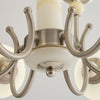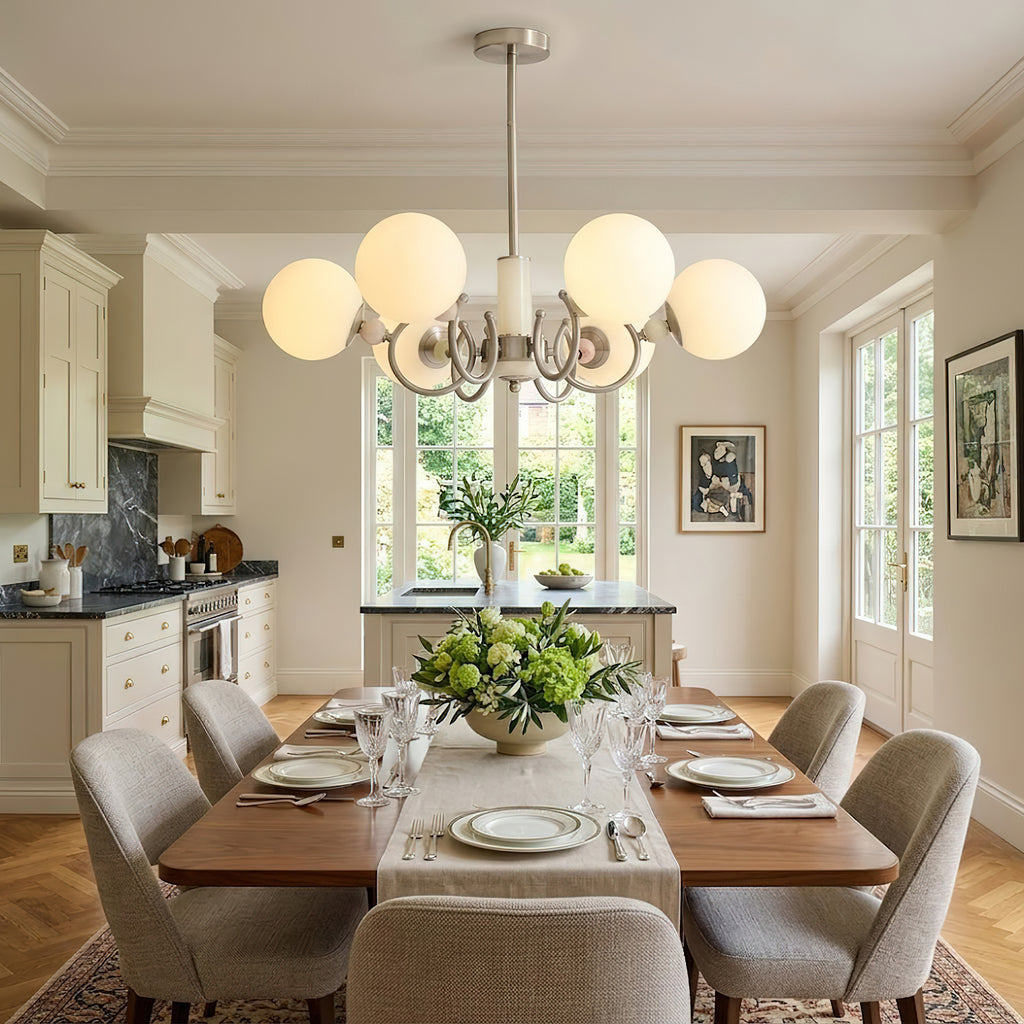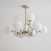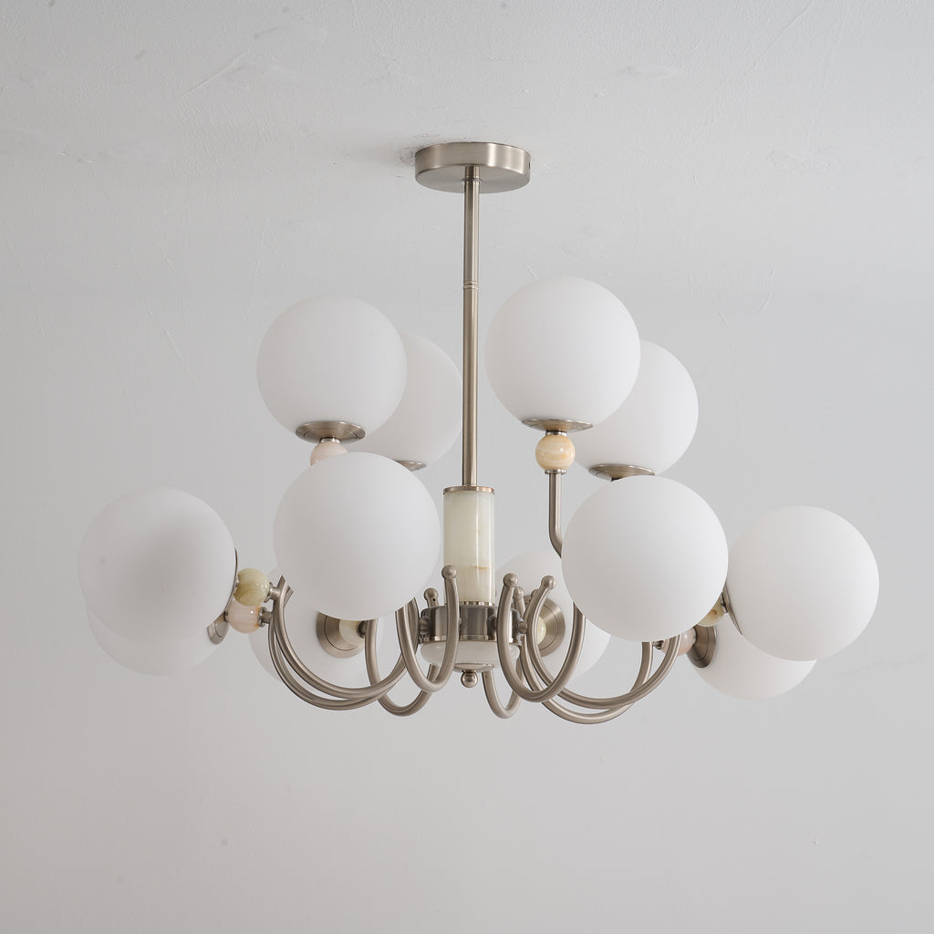 This is a sophisticated mid-century modern multi-head chandelier. Its core frame is crafted from high-quality sandblasted nickel-colored iron, with flowing, curved arms radiating outwards from the center, creating a stable yet dynamic effect. The central pillar is adorned with unique jade, its warm, natural texture contrasting sharply with the cool metallic feel, lending the chandelier an elegant and profound artistic aura.