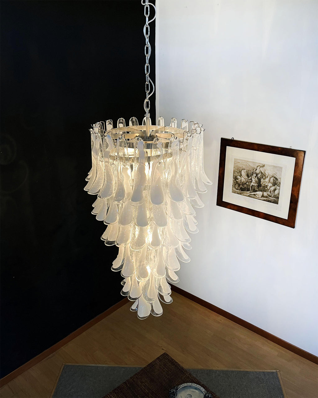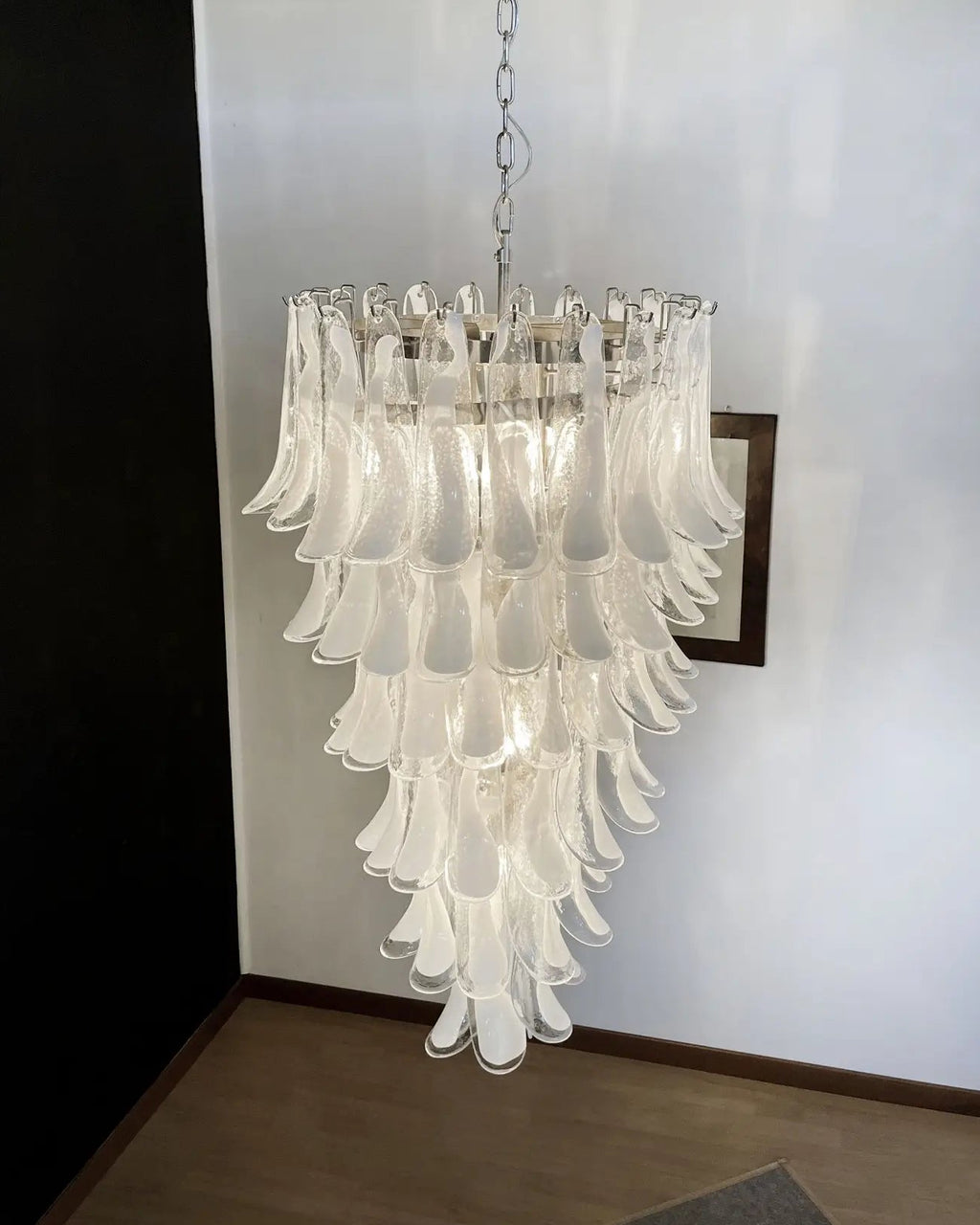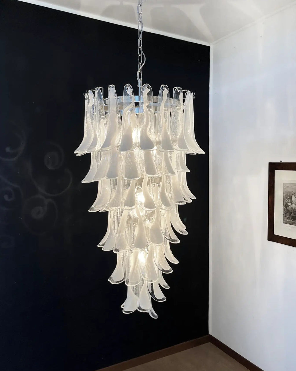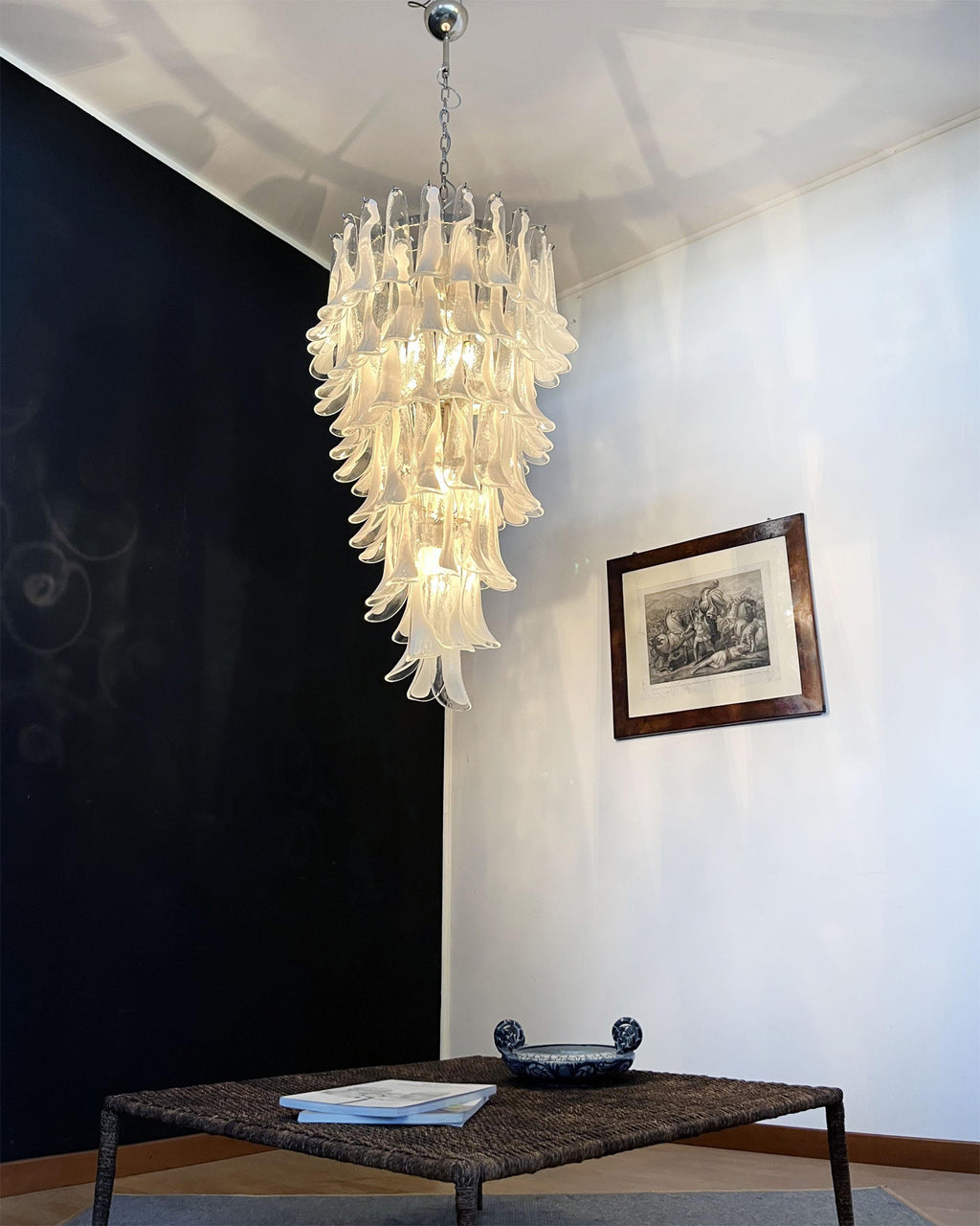 This is the Flares Chandelier, often recognized as a stunning Murano Glass Spiral Chandelier. This piece is pure drama and luxury. It provides a luxurious, ambient, and very flattering glow, making the fixture look like a soft, glittering cloud.