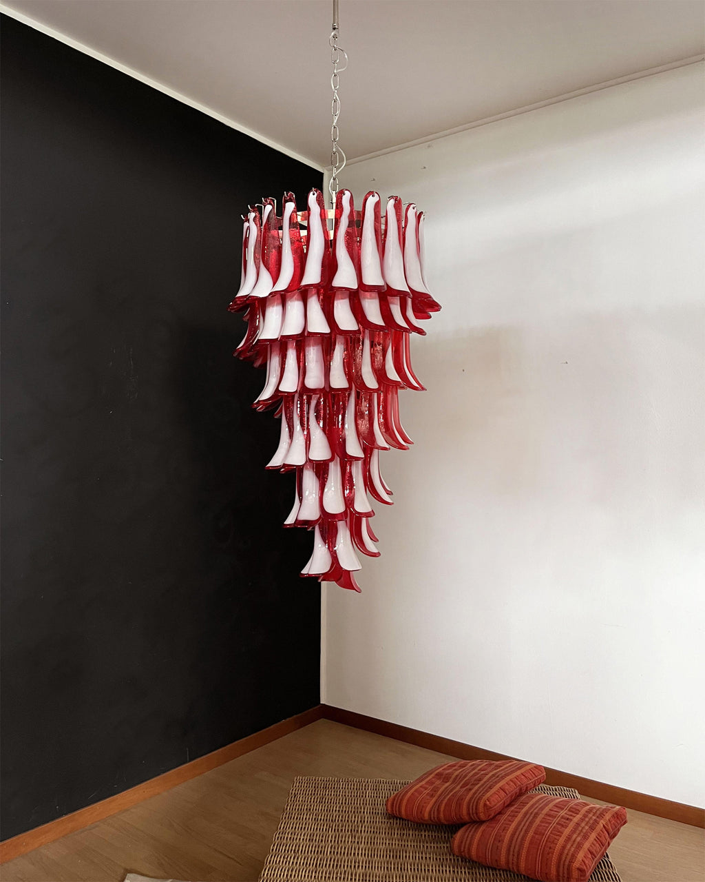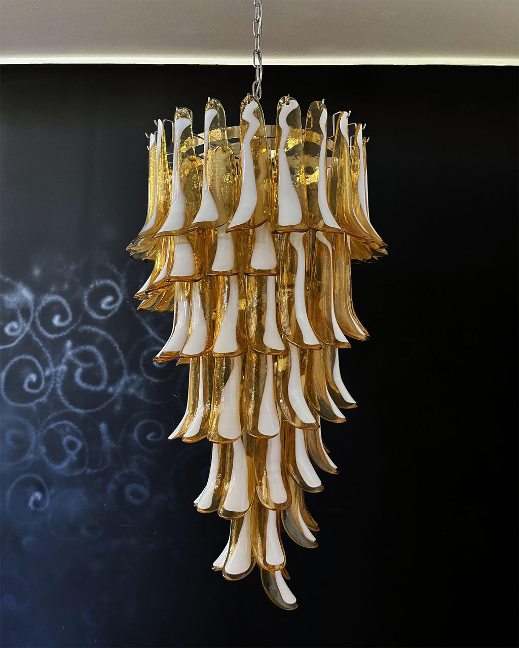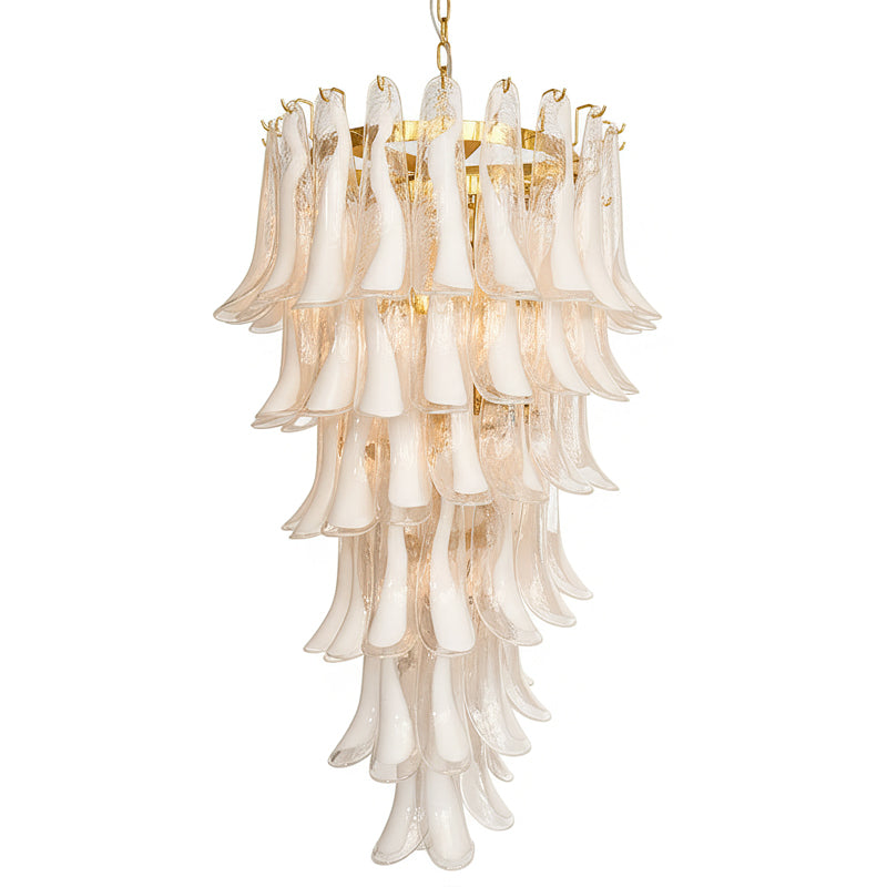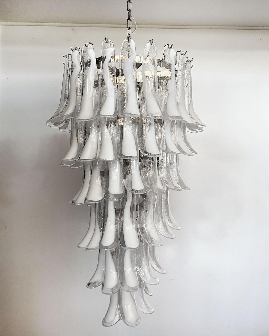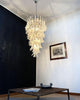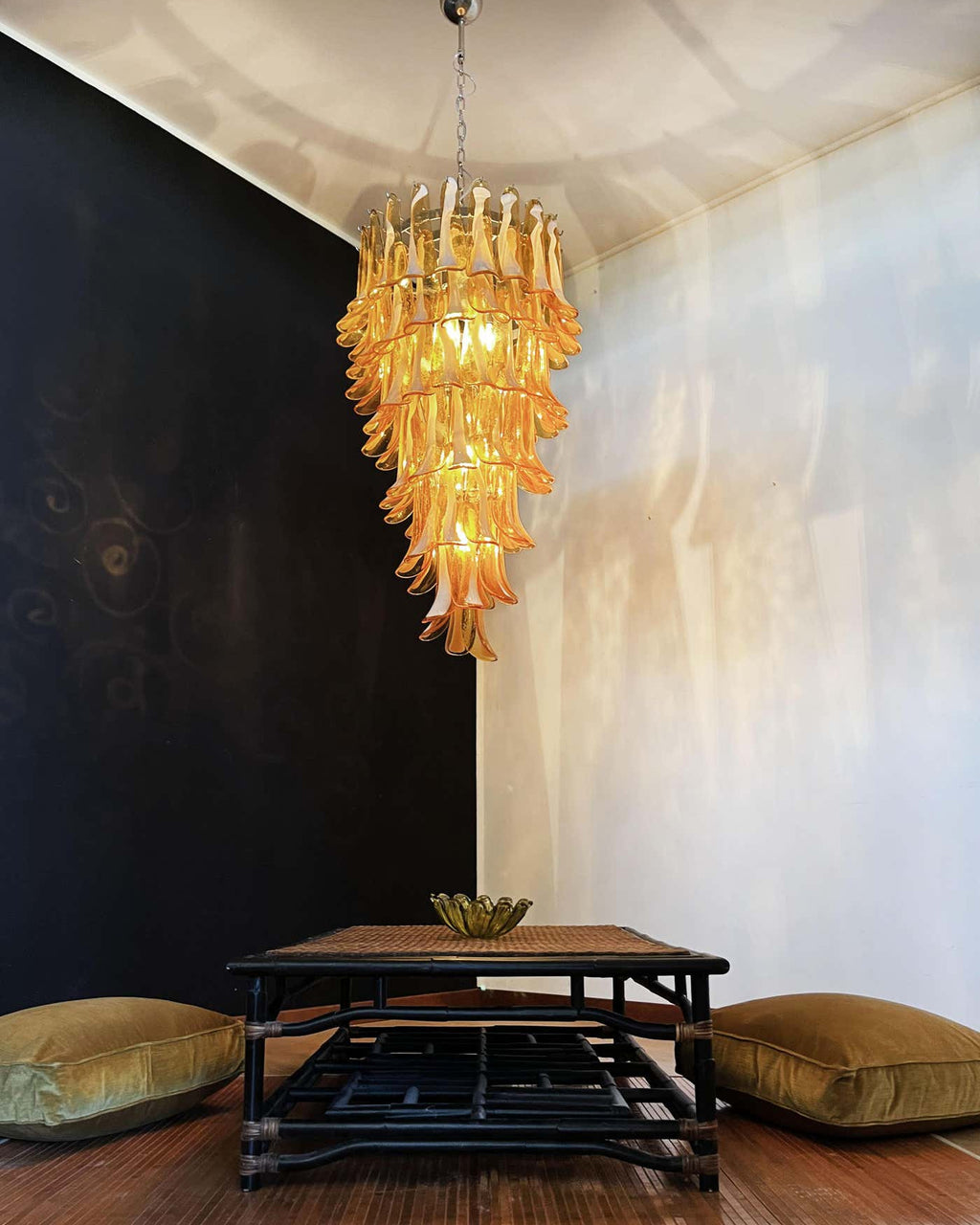 This is the Flares Chandelier, often recognized as a stunning Murano Glass Spiral Chandelier. This piece is pure drama and luxury. It provides a luxurious, ambient, and very flattering glow, making the fixture look like a soft, glittering cloud.