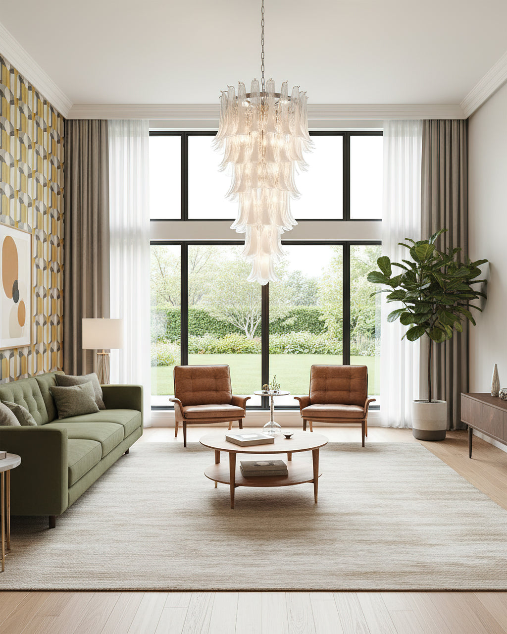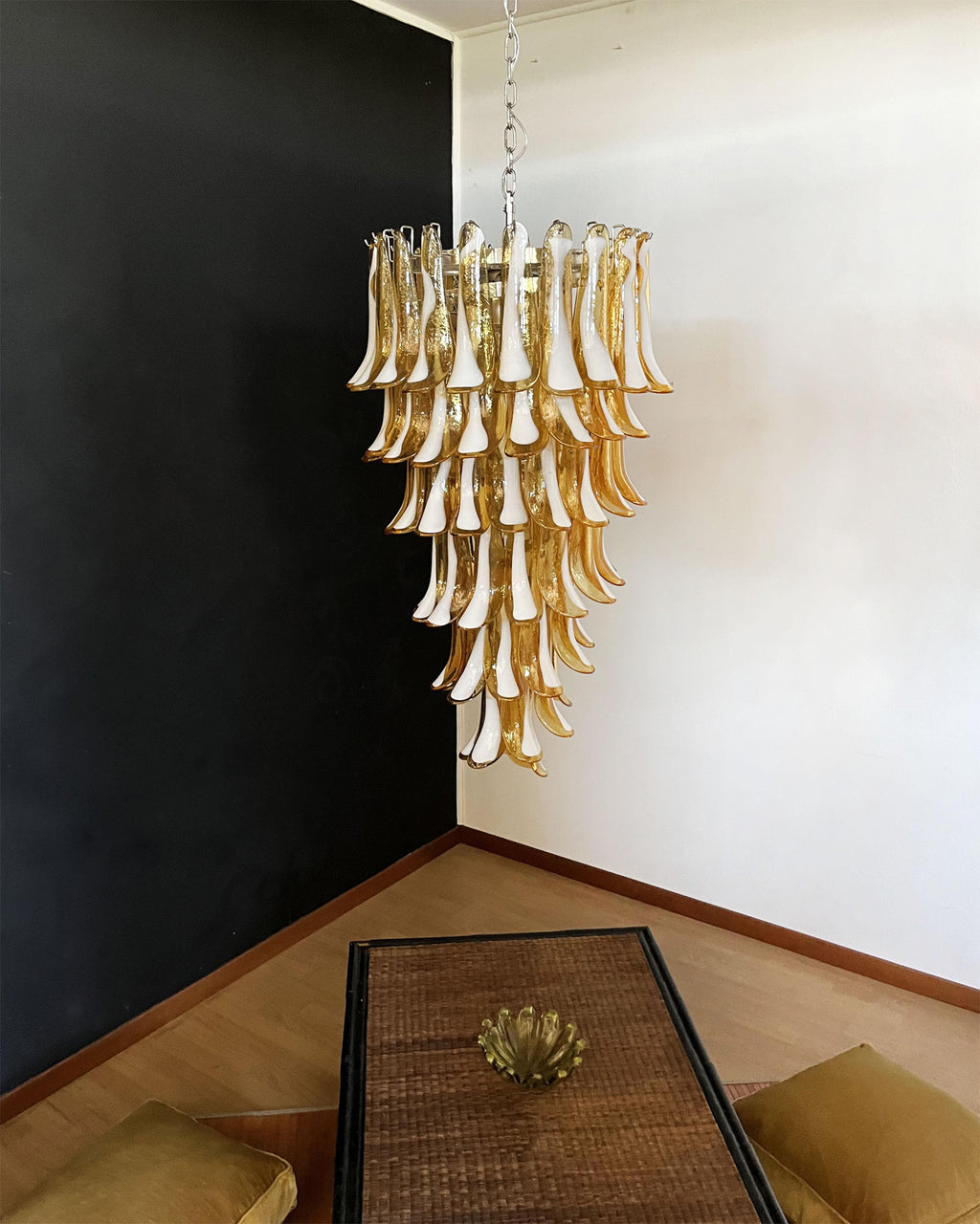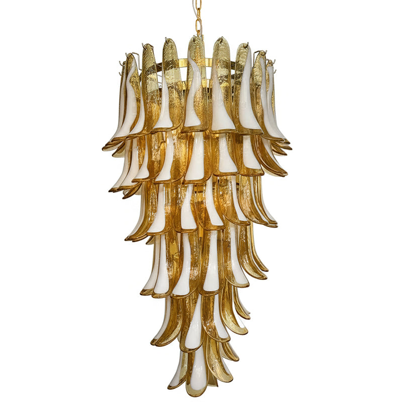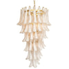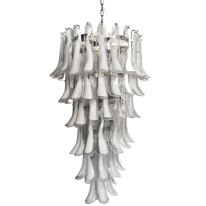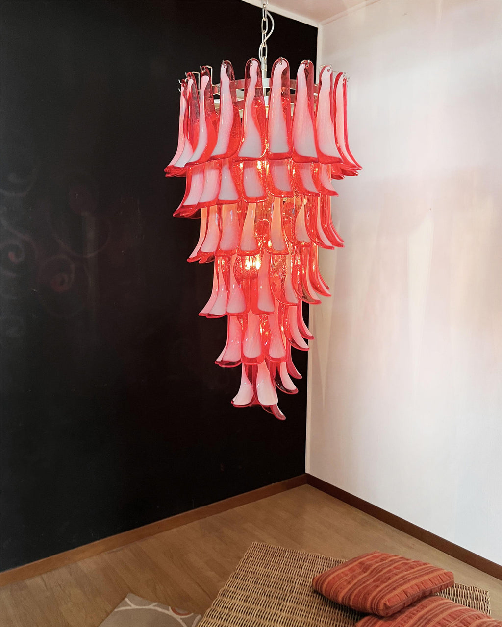 This is the Flares Chandelier, often recognized as a stunning Murano Glass Spiral Chandelier. This piece is pure drama and luxury. It provides a luxurious, ambient, and very flattering glow, making the fixture look like a soft, glittering cloud.