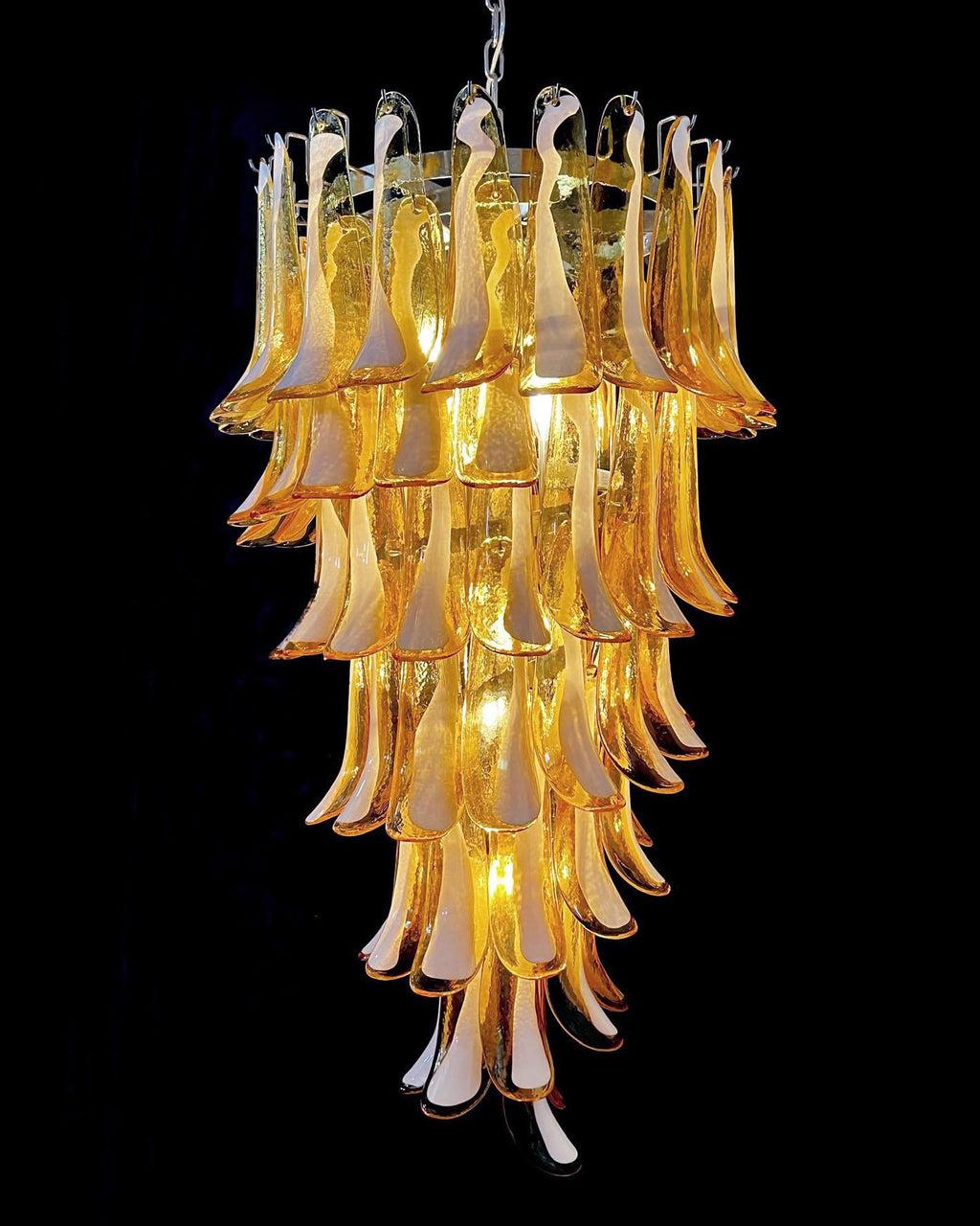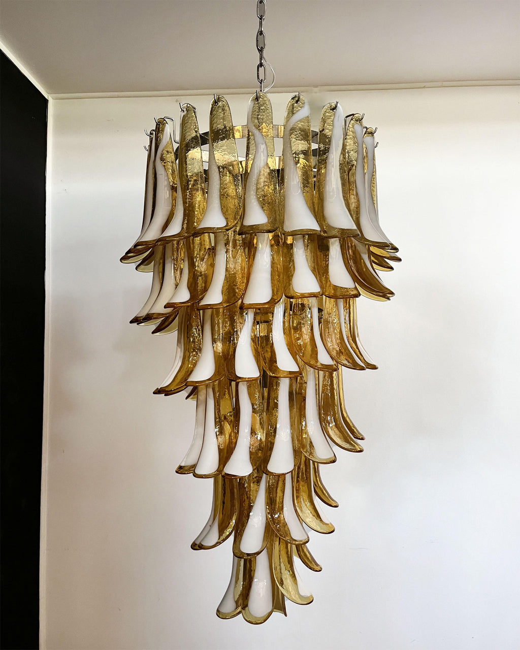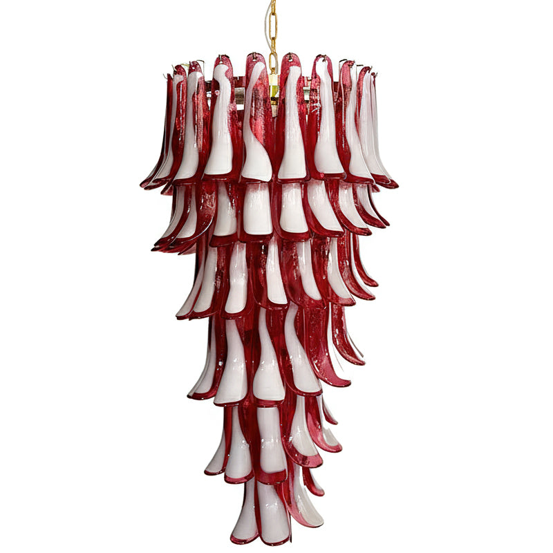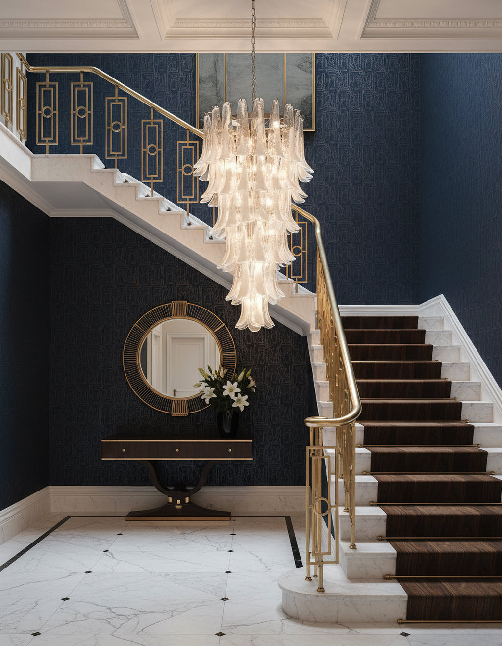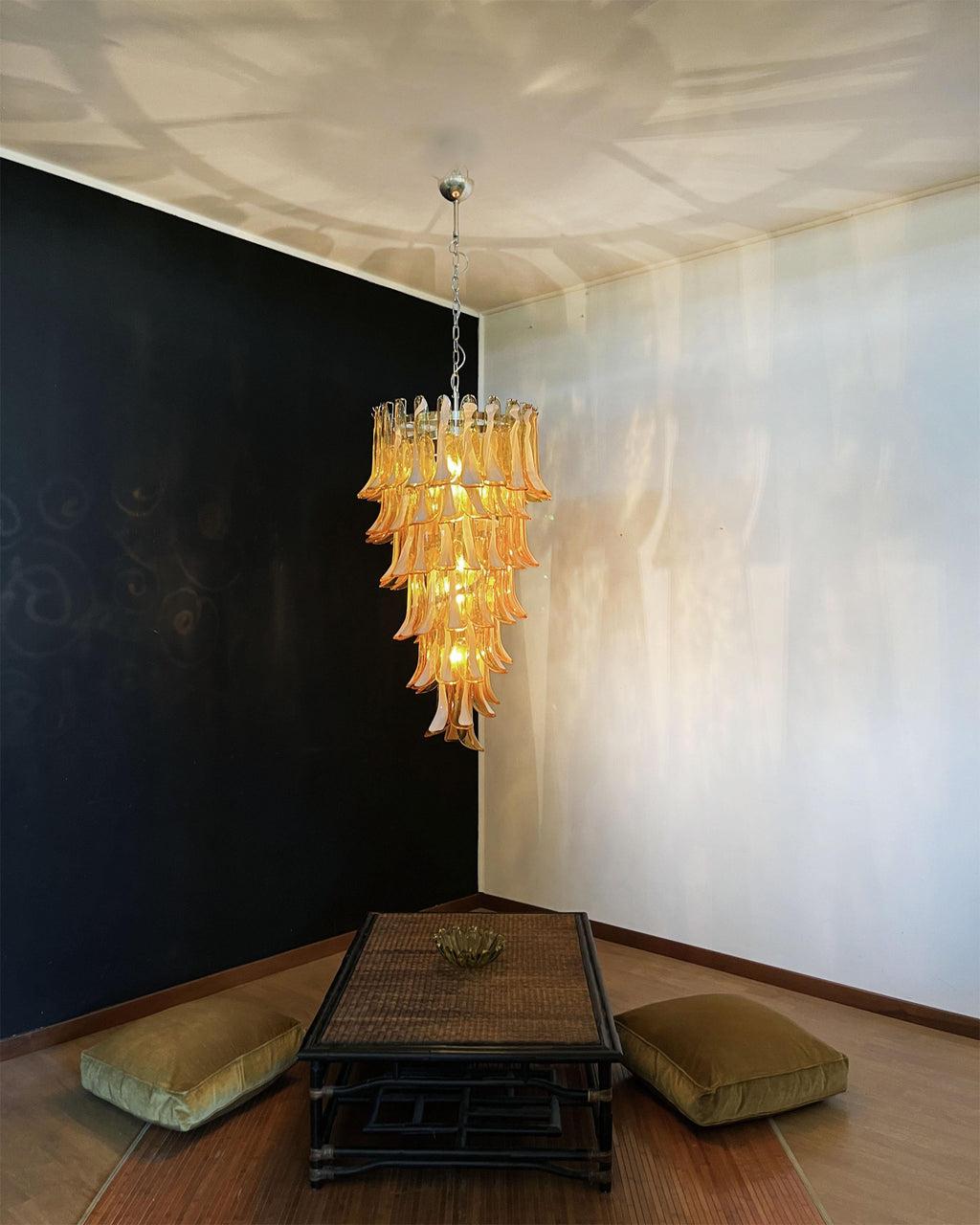 This is the Flares Chandelier, often recognized as a stunning Murano Glass Spiral Chandelier. This piece is pure drama and luxury. It provides a luxurious, ambient, and very flattering glow, making the fixture look like a soft, glittering cloud.