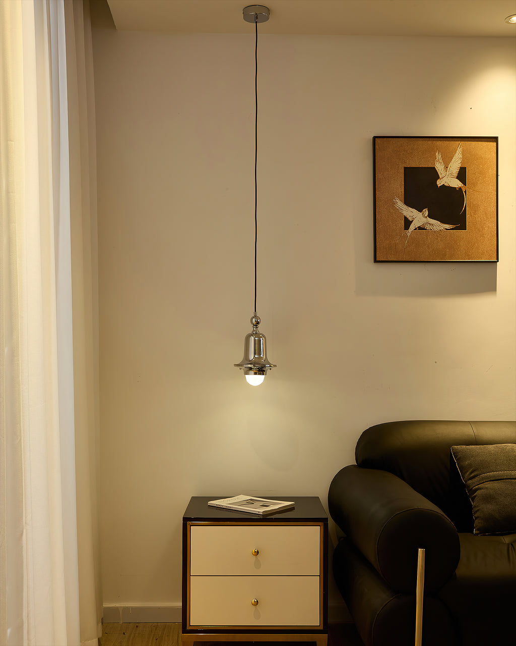 Evoke the timeless elegance of mid-century design with the Allen Pendant Light. Defined by its graceful bell-shaped silhouette and high-polish chrome finish, this fixture serves as a brilliant focal point for any interior.