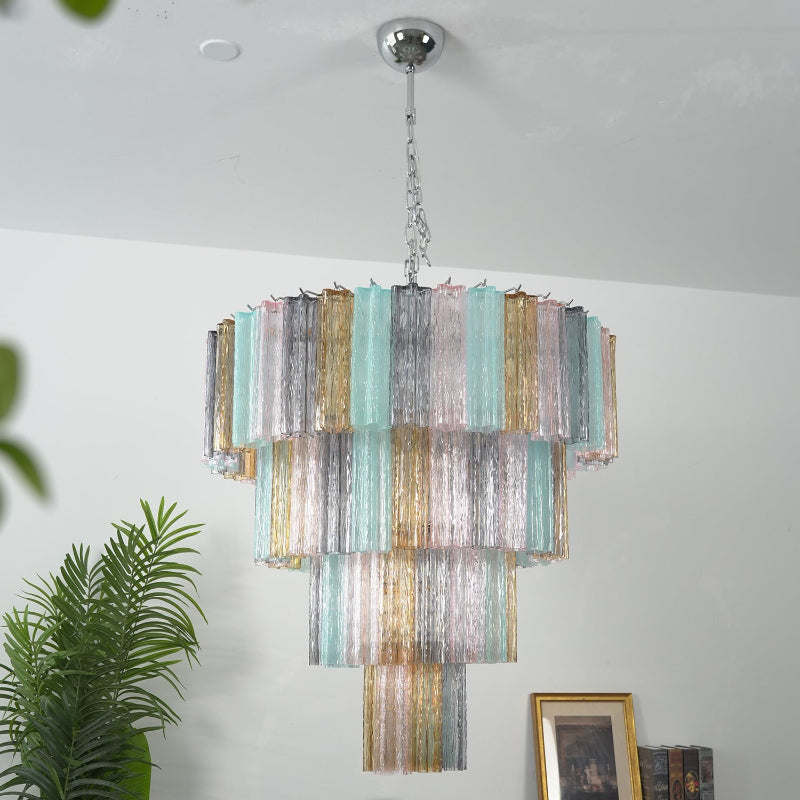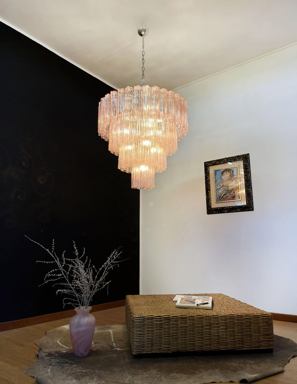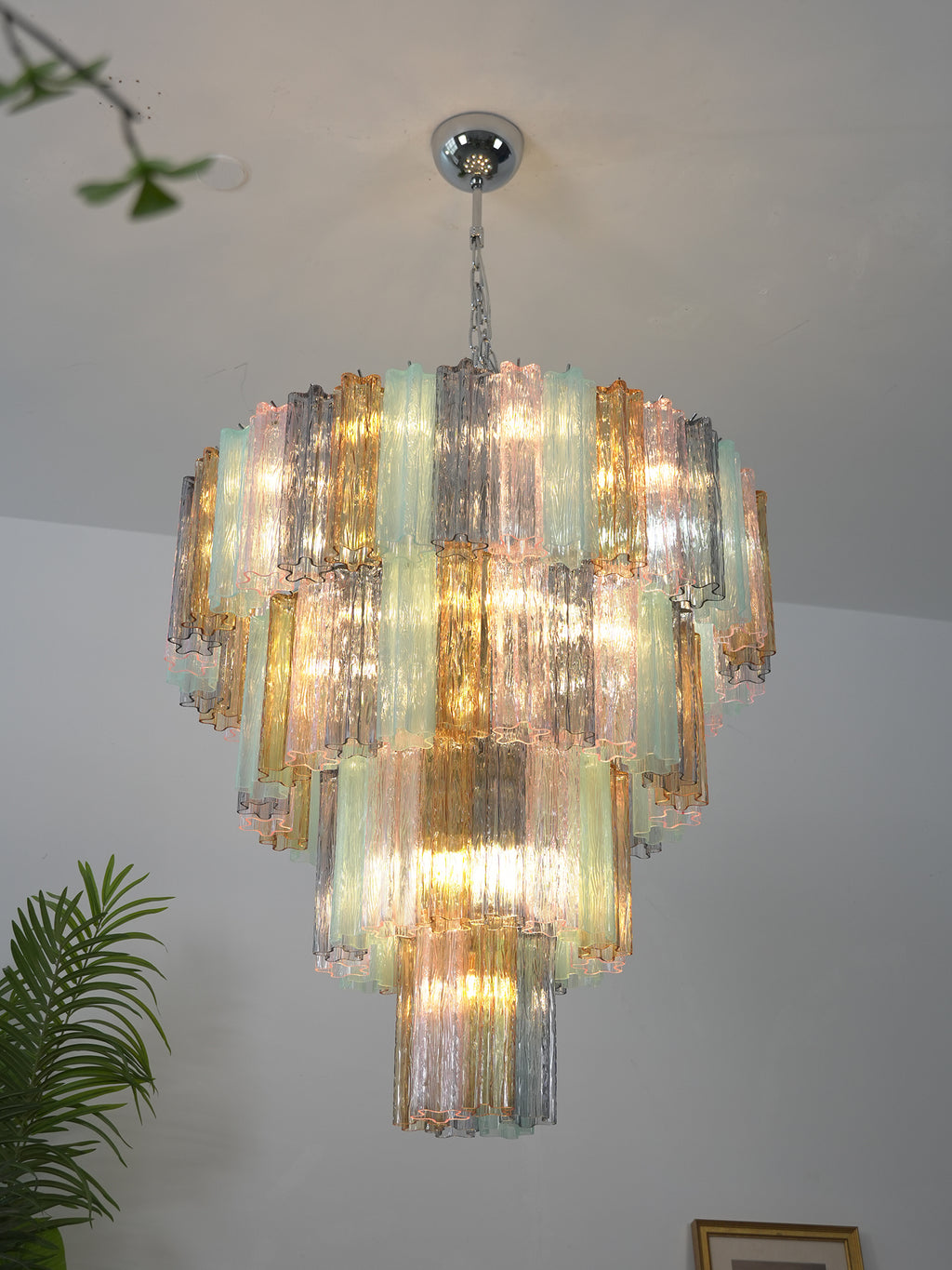 The Tronchi Glass Chandelier showcases authentic Murano glass craftsmanship, featuring hand-blown cylindrical elements that capture and refract light with exceptional clarity. Each piece reflects the artisanal mastery of Venetian glassmakers, delivering sophisticated illumination for discerning interiors. The luminous glass construction creates dynamic visual depth while providing warm, diffused ambient lighting. An investment in timeless design that combines functional elegance with museum-quality artistry.