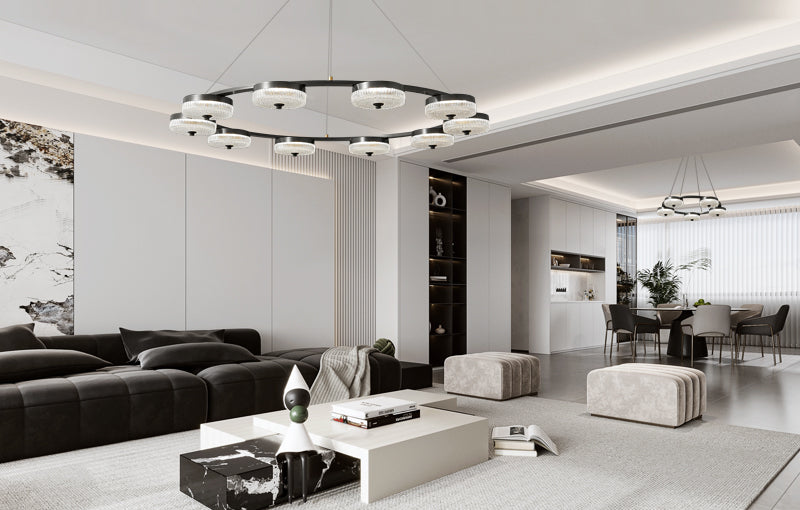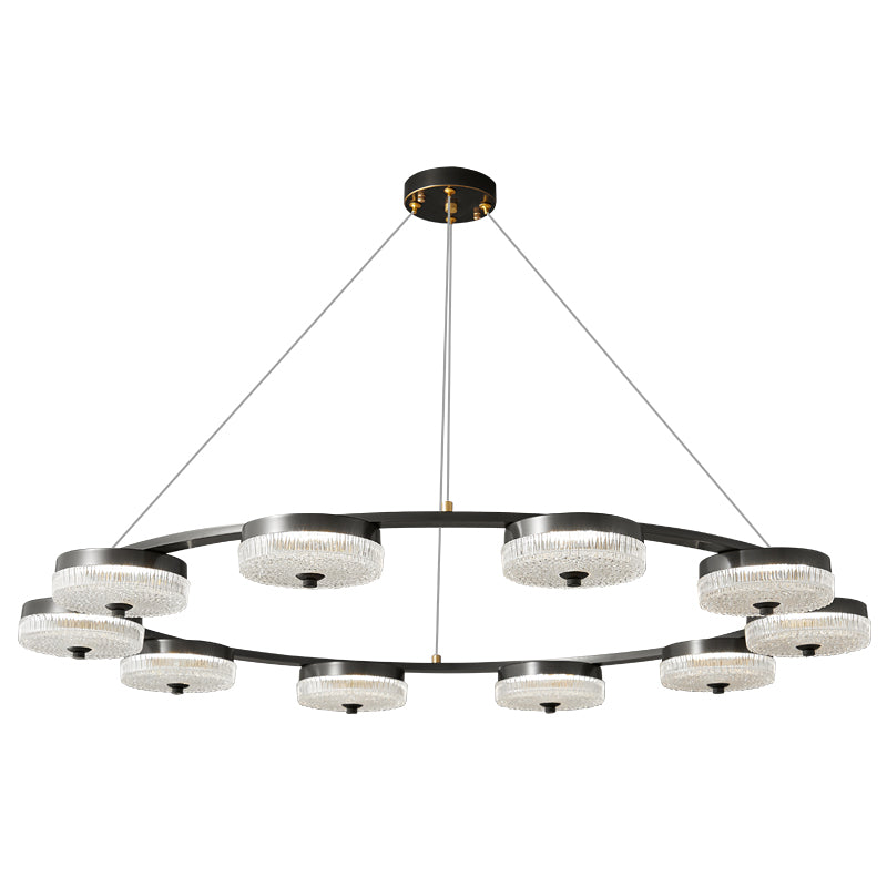 This chandelier features circular designs that evoke the motion of celestial bodies. Each piece is accented with crystal elements, creating a cosmic reflection of light that brings an enchanting sparkle to any room.