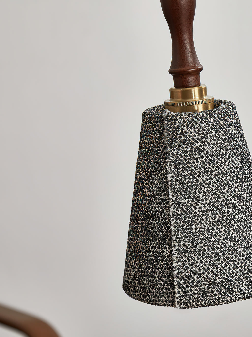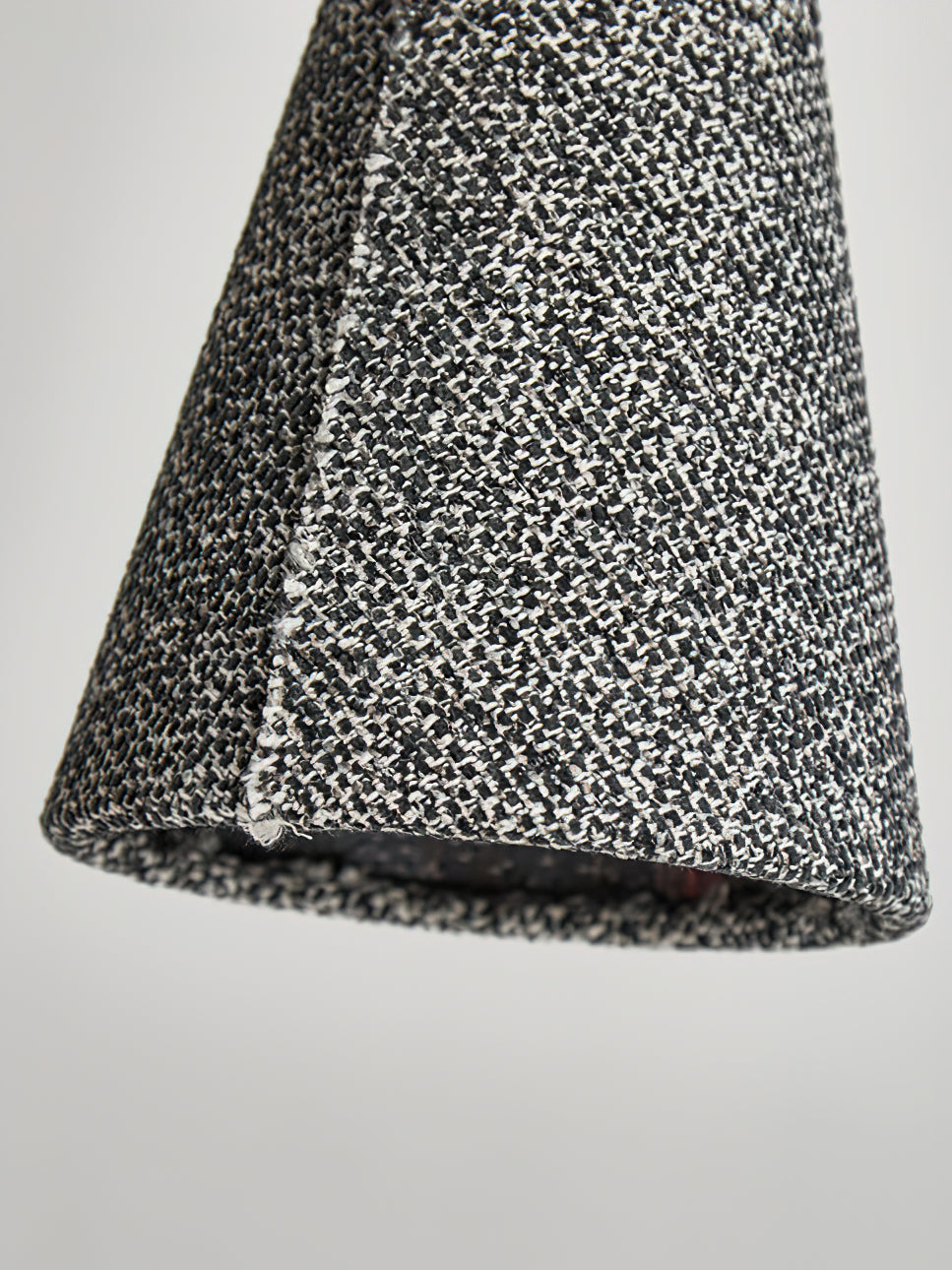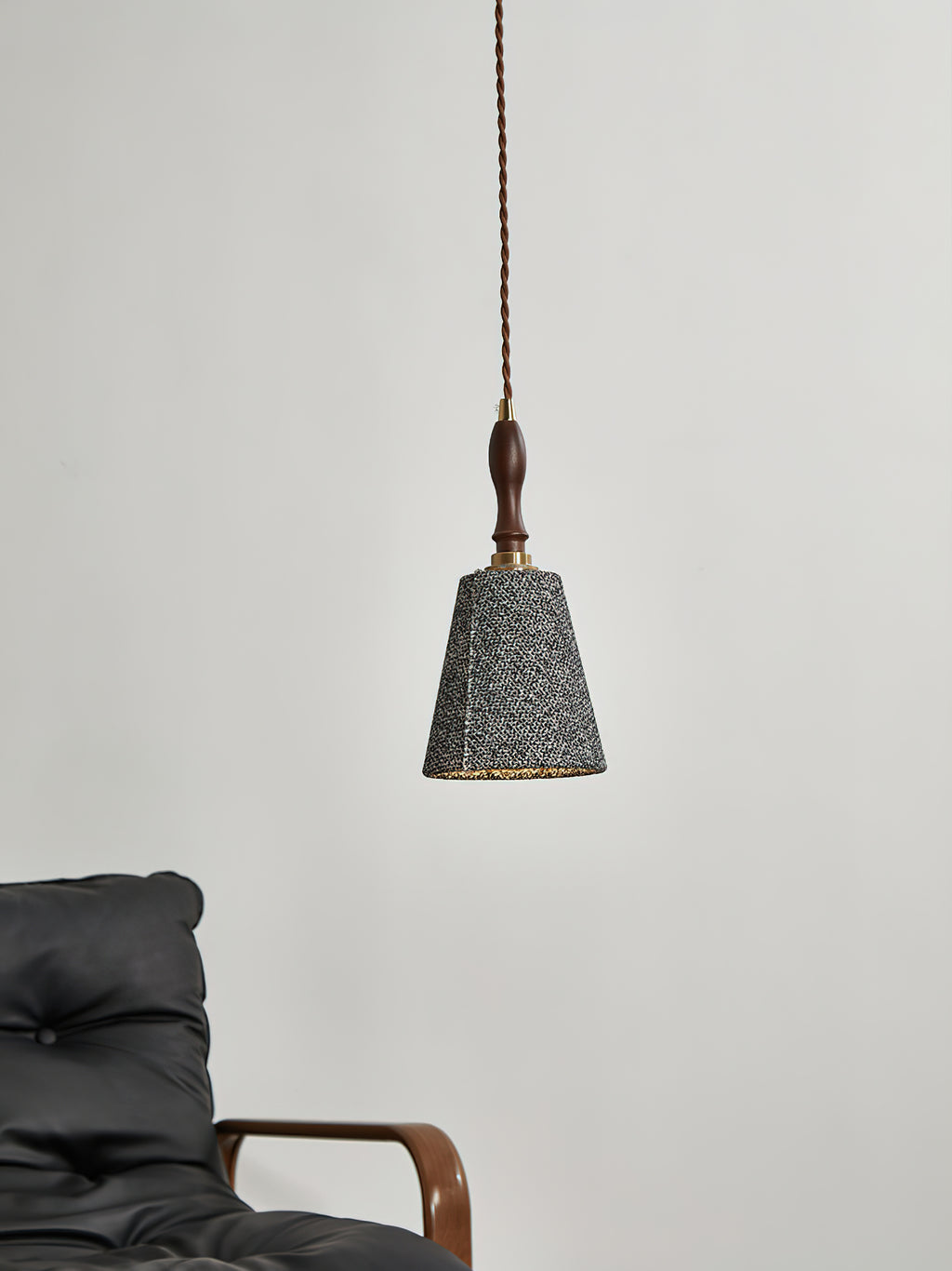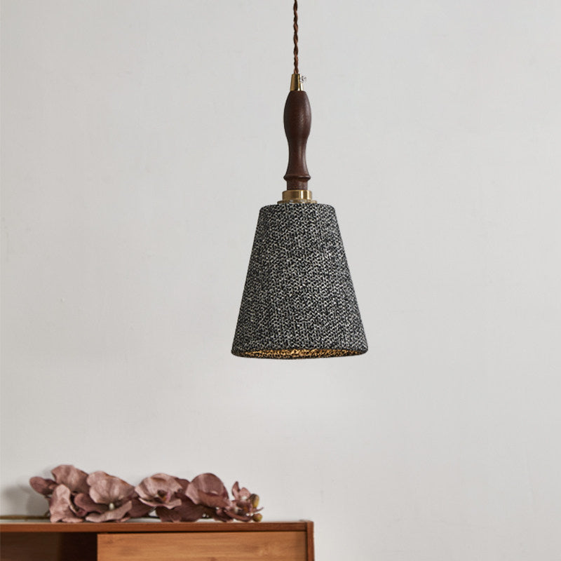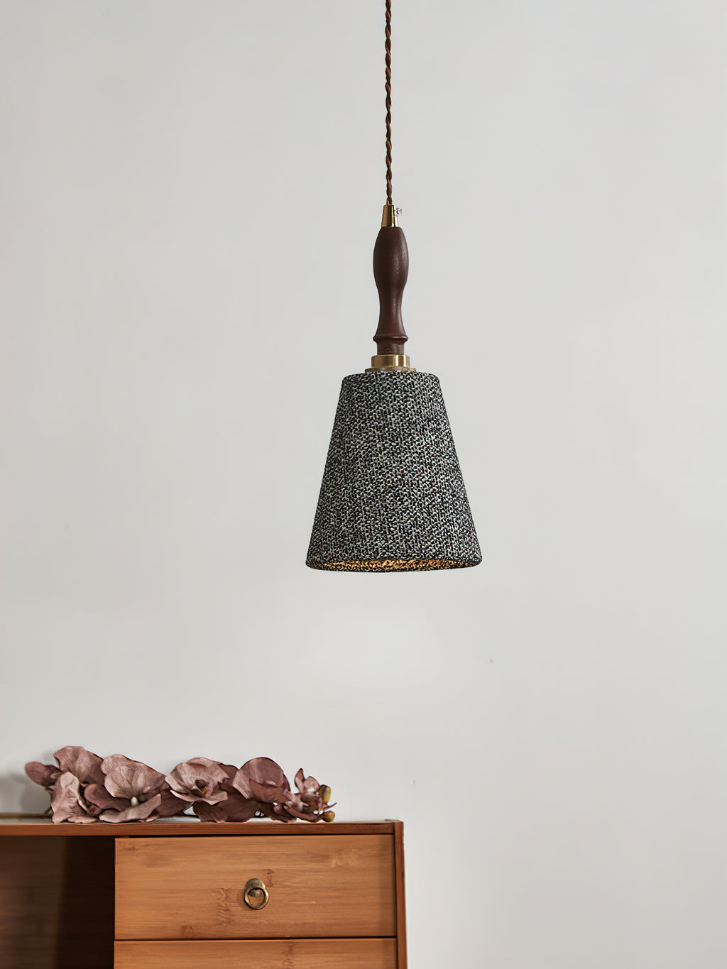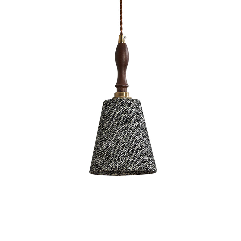 This pendant light masterfully balances vintage soul with modern refinement. Its bell-shaped silhouette is wrapped in a sophisticated monochrome weave, creating a rhythmic texture that feels both grounded and dynamic. Crowned with a gracefully contoured dark stem and subtle metallic accents, the design exudes an air of quiet luxury and artisanal charm. When lit, the light filters through the intricate patterns to cast a soft, evocative glow, transforming any room into a sanctuary of warmth and timeless style.