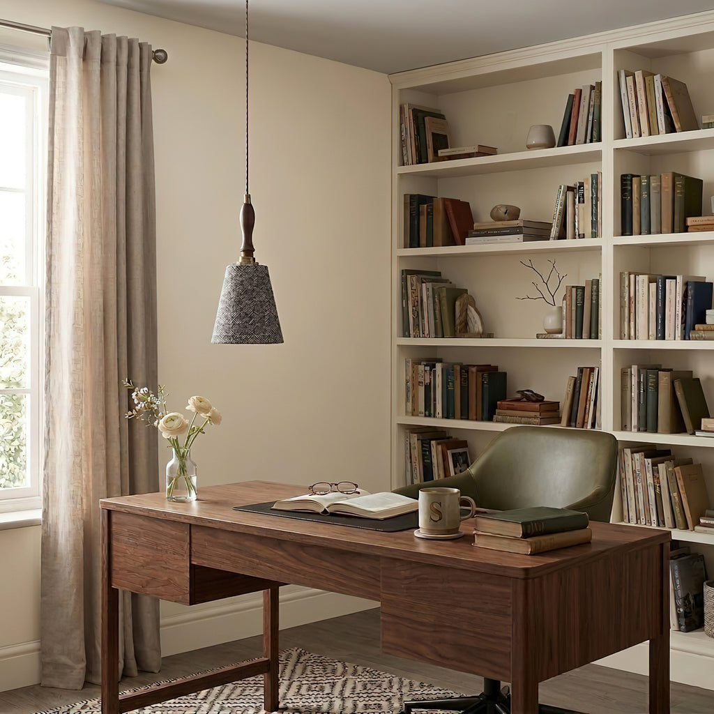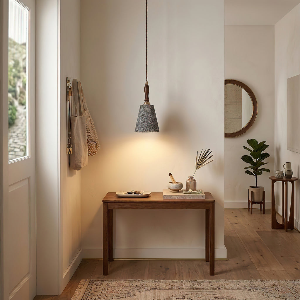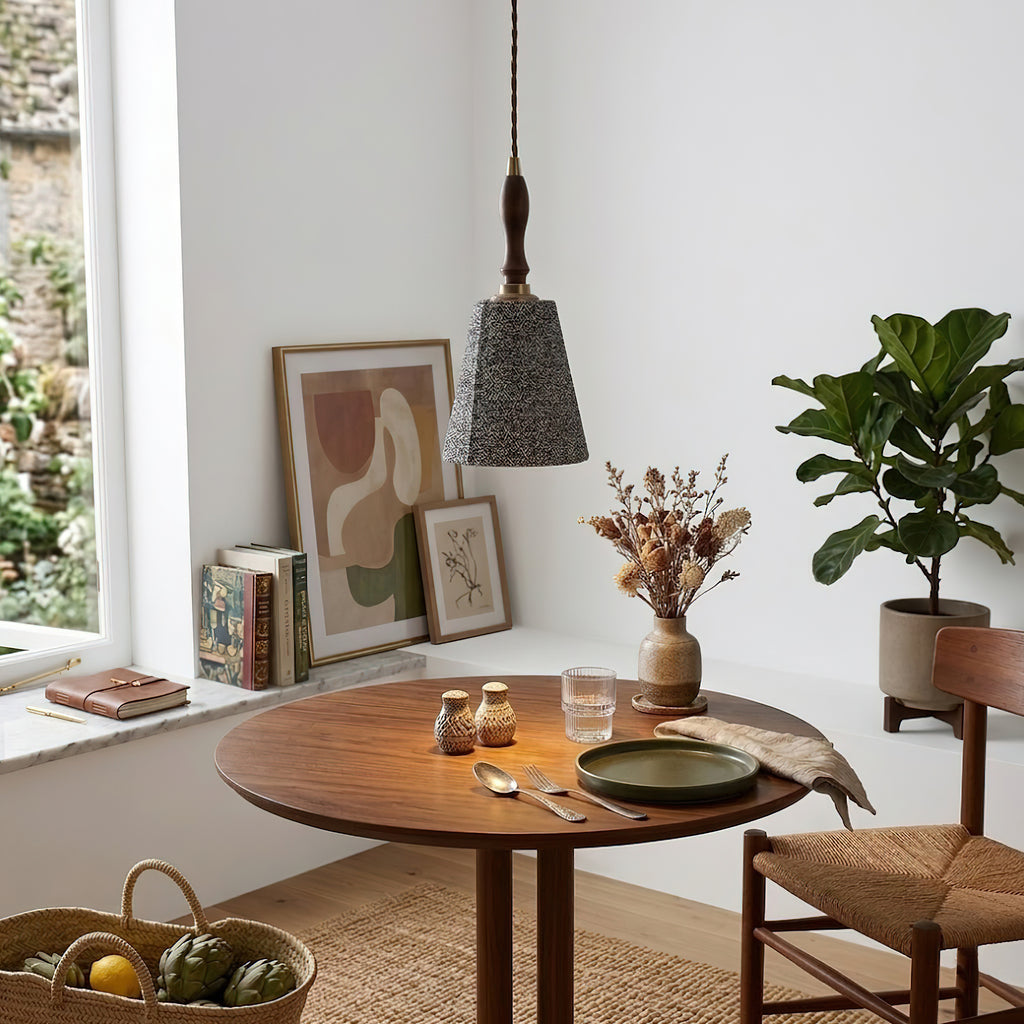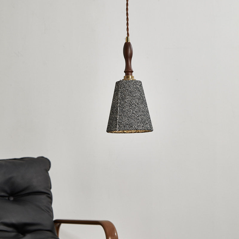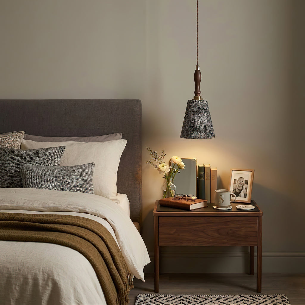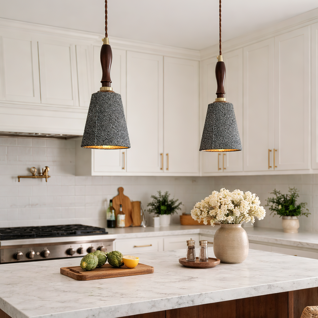 This pendant light masterfully balances vintage soul with modern refinement. Its bell-shaped silhouette is wrapped in a sophisticated monochrome weave, creating a rhythmic texture that feels both grounded and dynamic. Crowned with a gracefully contoured dark stem and subtle metallic accents, the design exudes an air of quiet luxury and artisanal charm. When lit, the light filters through the intricate patterns to cast a soft, evocative glow, transforming any room into a sanctuary of warmth and timeless style.