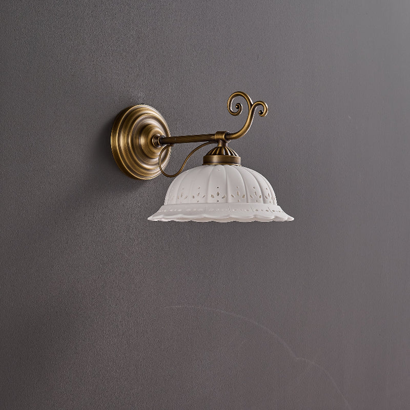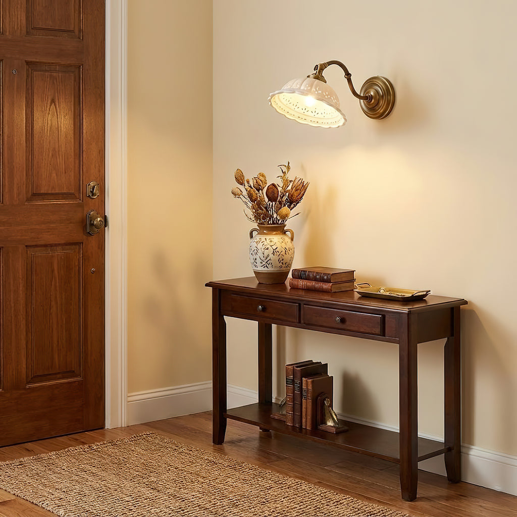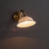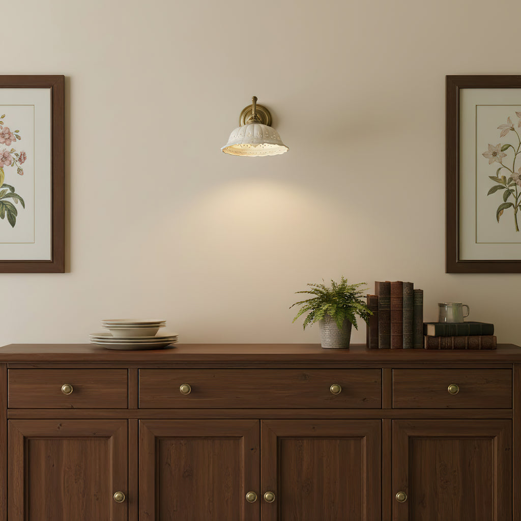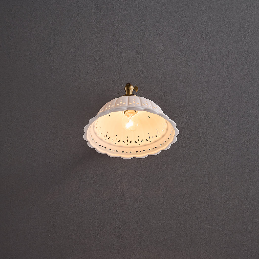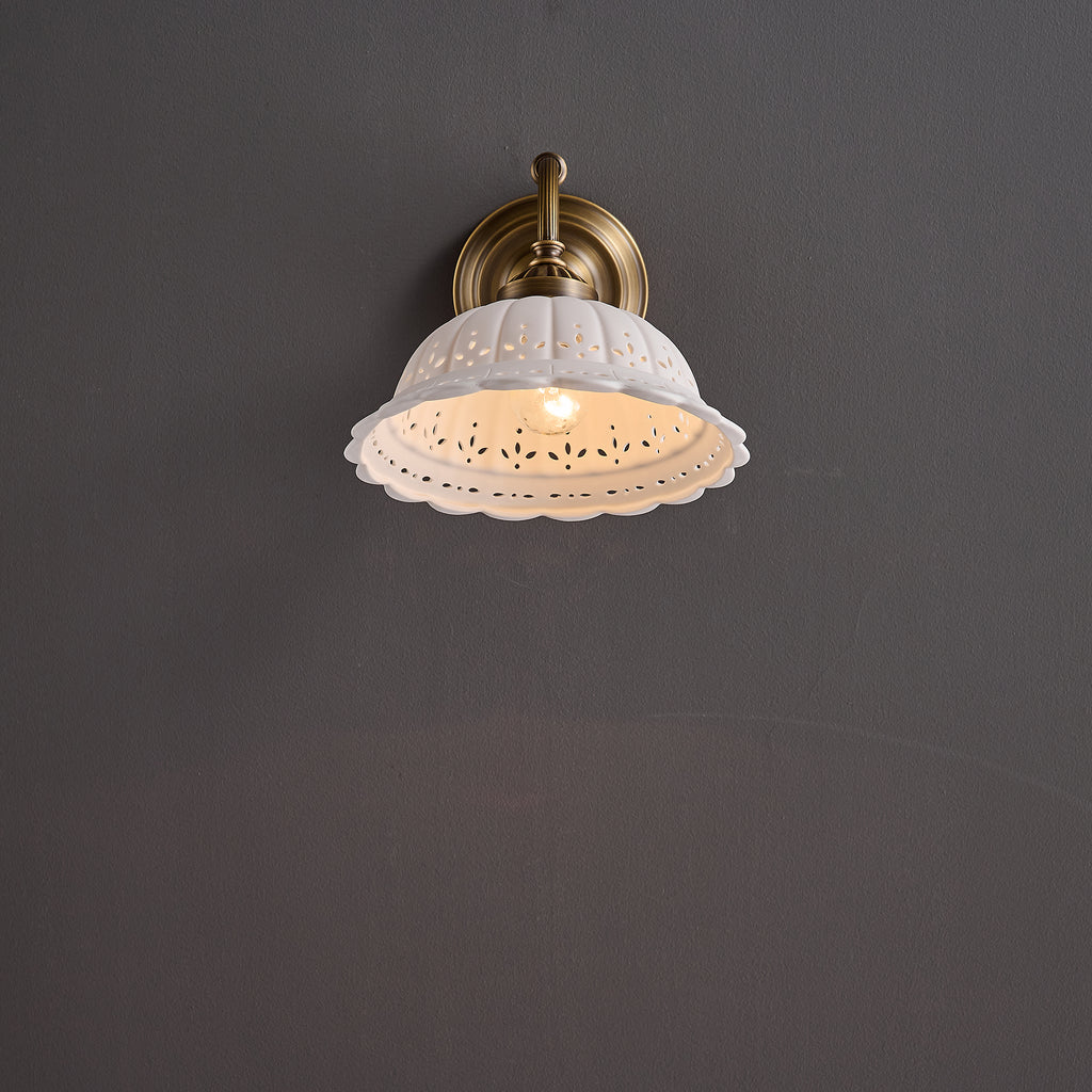 The Rochelle Filigree Sconce combines artisanal ceramics with refined brass detailing to create a sophisticated wall fixture. Delicate filigree patterns carved into the ceramic body cast intricate shadows, adding visual depth to any room. The warm brass hardware complements both contemporary and traditional interiors, while the handcrafted quality ensures each piece carries distinctive character. Perfect for entryways, bedrooms, or accent walls where ambient lighting meets sculptural elegance.