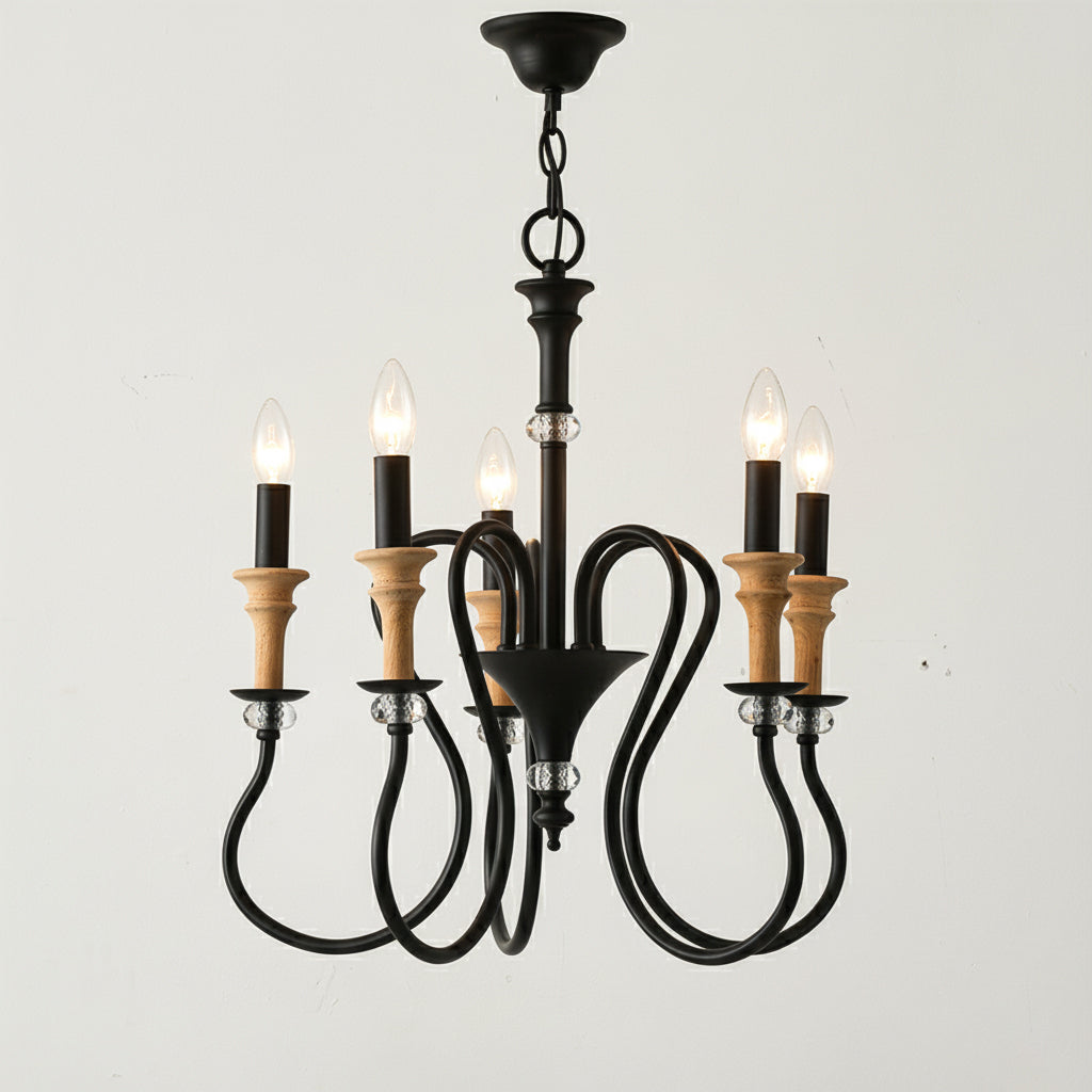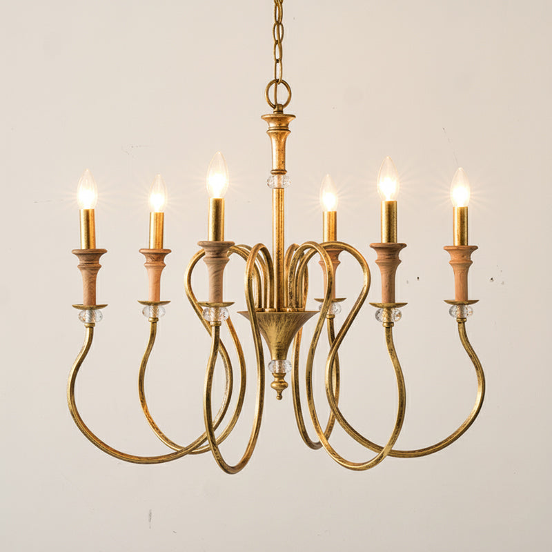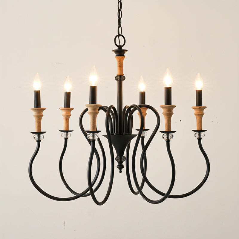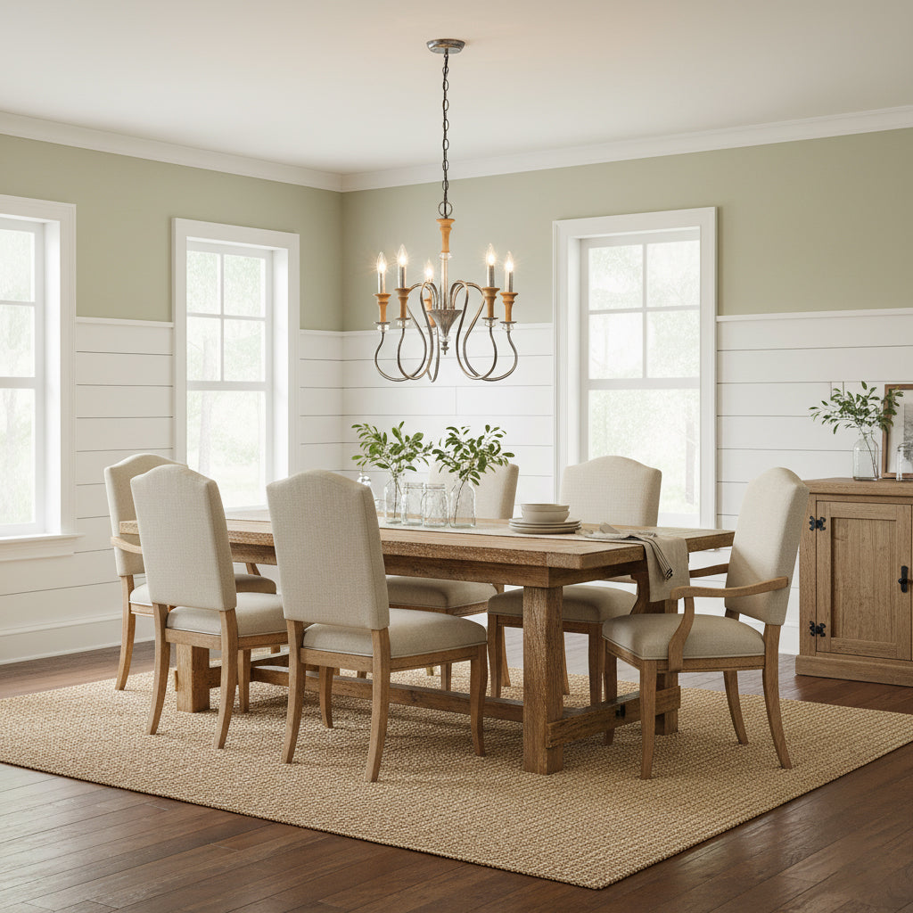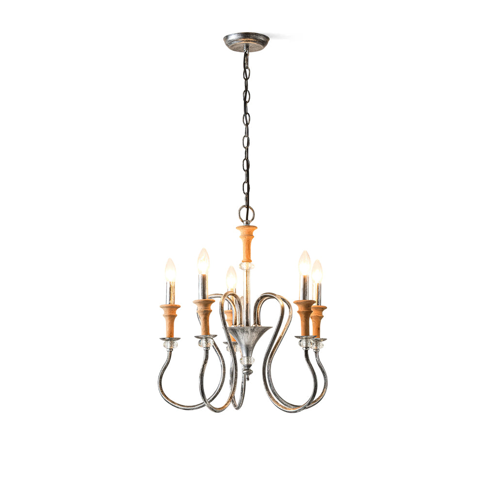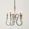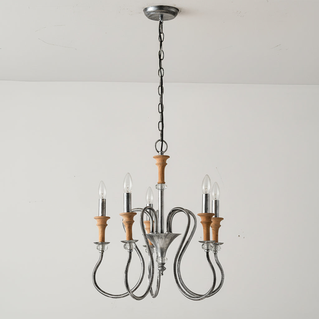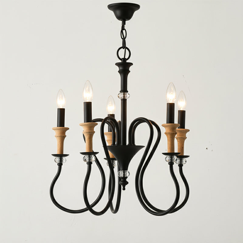 The Freddi Pendant Light is a charming 5-light chandelier that beautifully blends rustic warmth with refined. Features five gracefully curved arms in a classic French Country or Farmhouse style. The elegant curves and wood detailing create a timeless, inviting look.