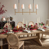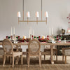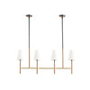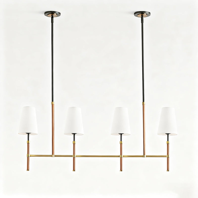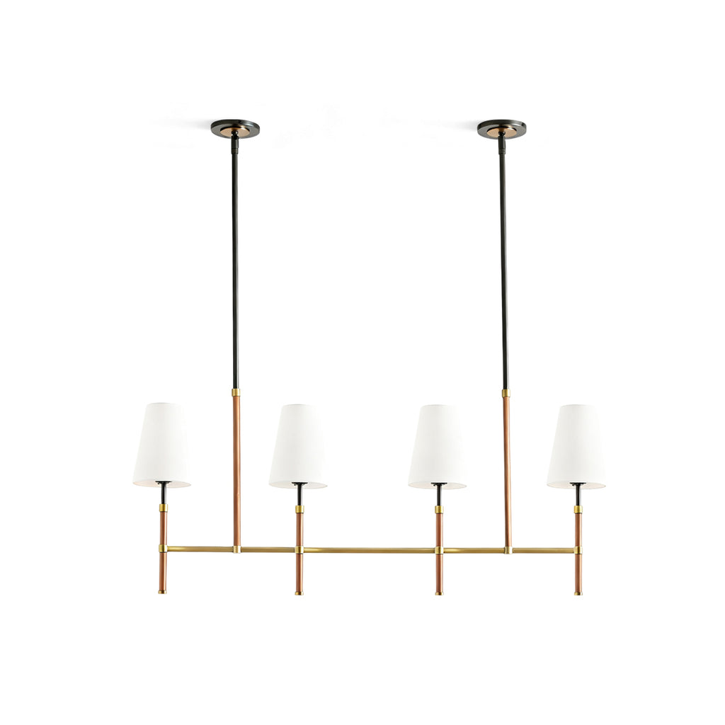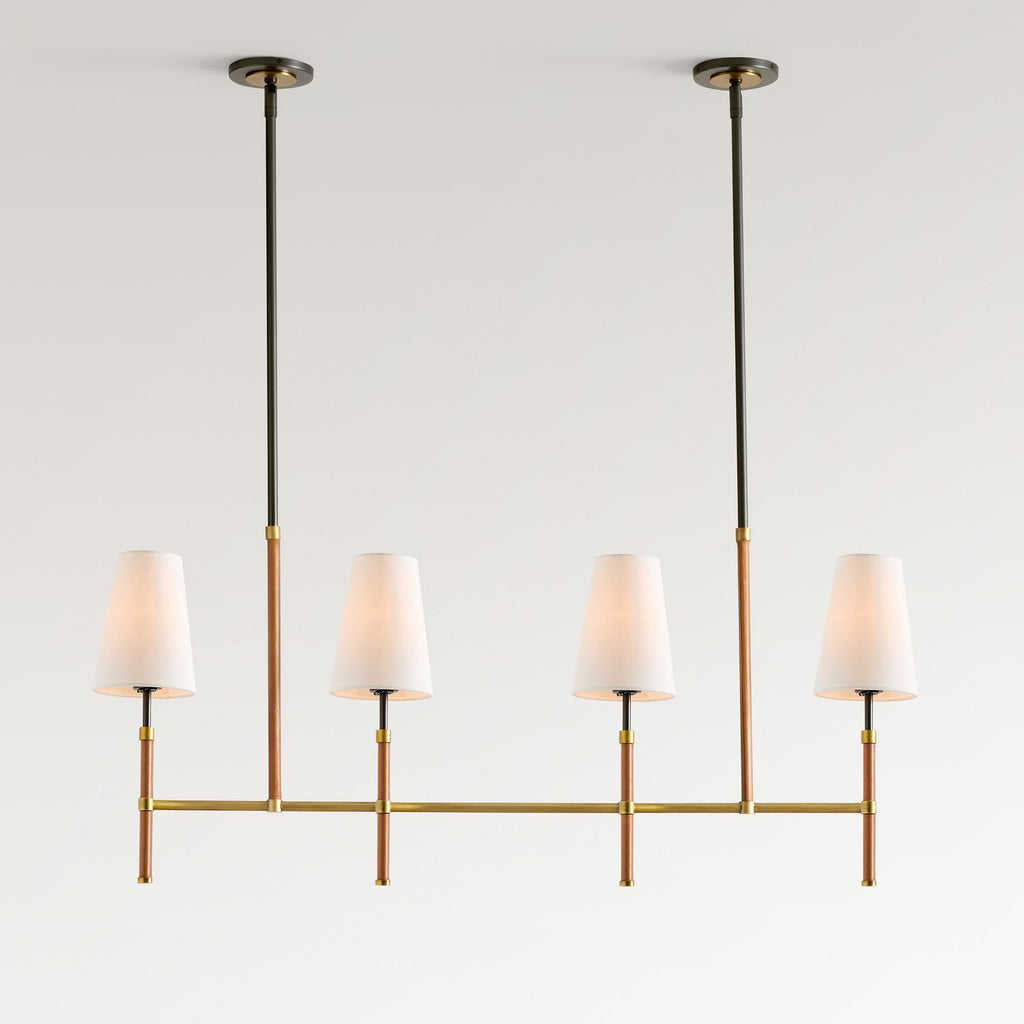 The Leigh Island Chandelier combines refined craftsmanship with sophisticated materials. This striking fixture features a sculptural brass frame that anchors the design, complemented by carefully selected fabric and leather accents that add warmth and texture. The multi-material composition creates visual interest while maintaining an elegant aesthetic suitable for contemporary and transitional interiors.
