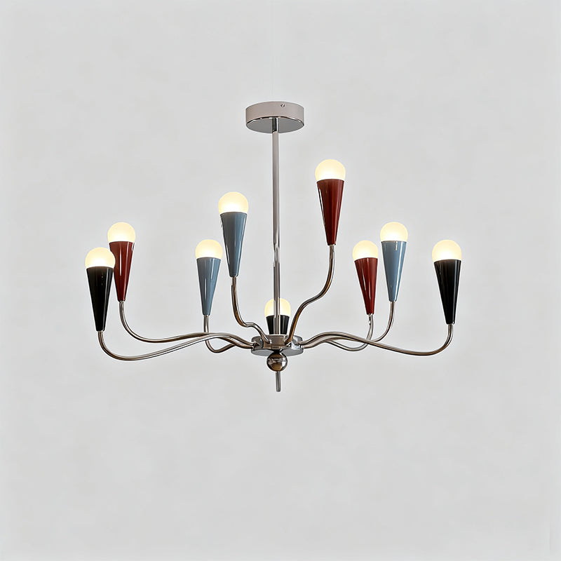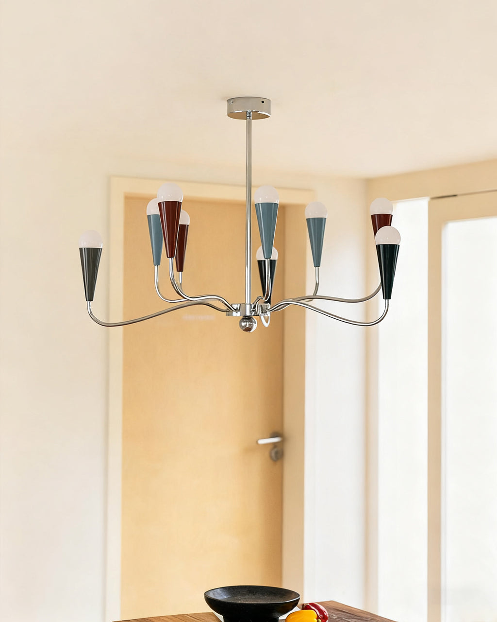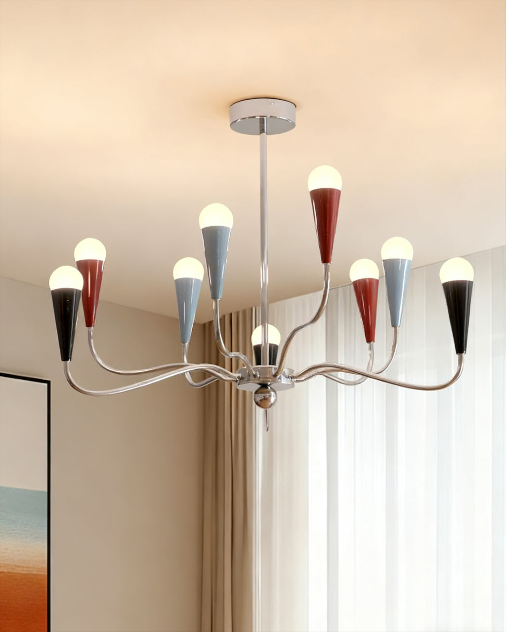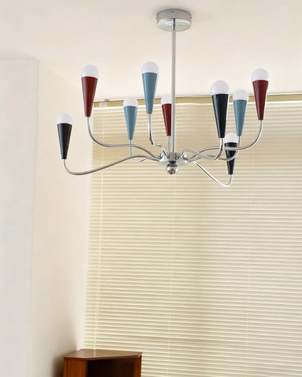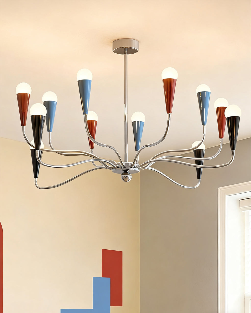 This Motiflow Chandelier is pure mid-century cool. It totally brings back that awesome retro style with the smooth, curved metal arms and those unique, colorful cone shades. The mix of the polished chrome frame and the pops of color—the red, blue-gray, and black—is super fun and stylish.