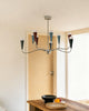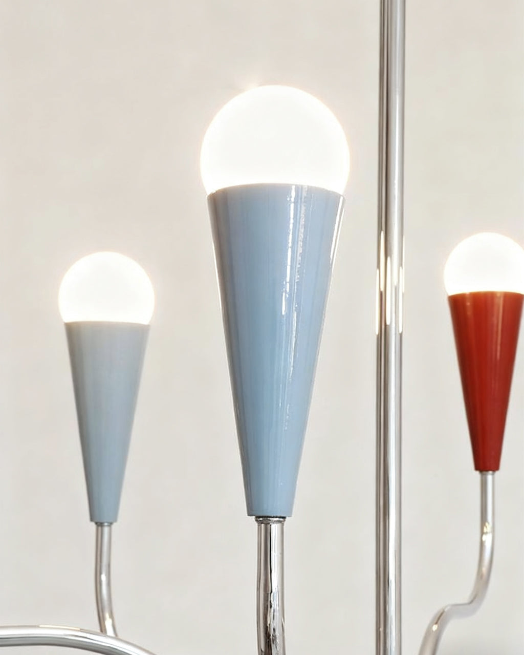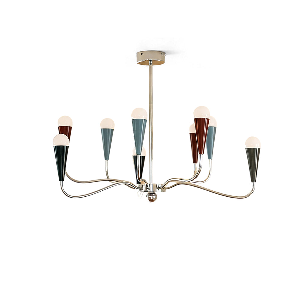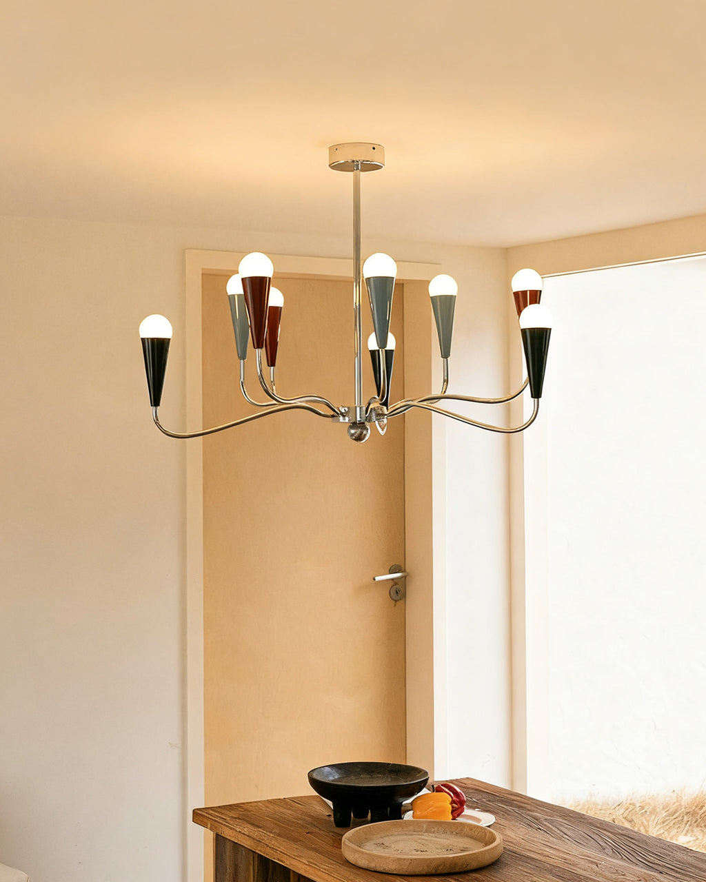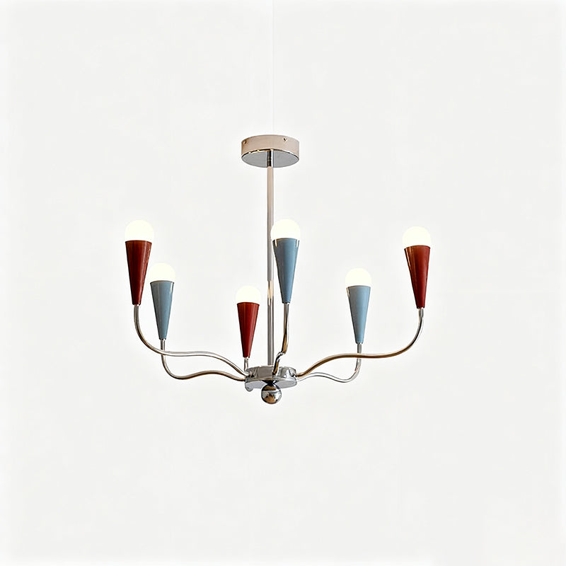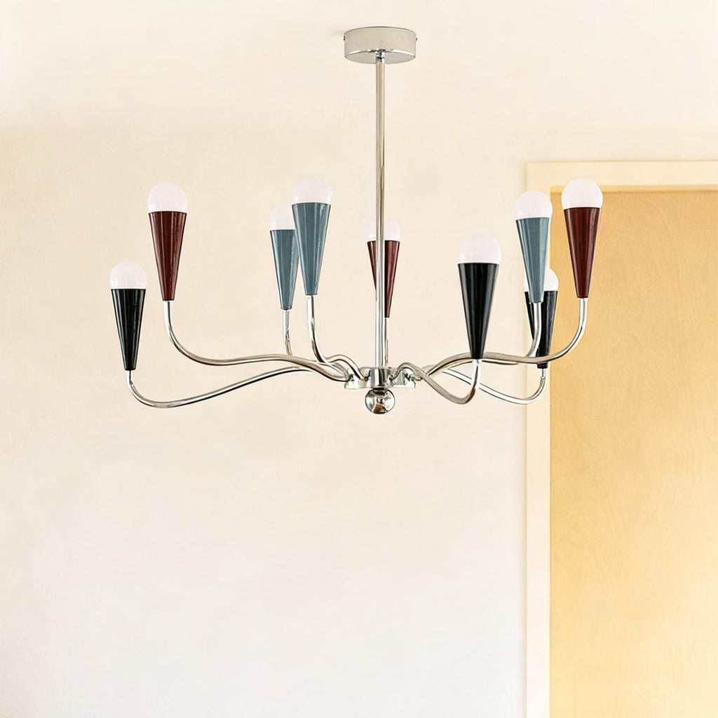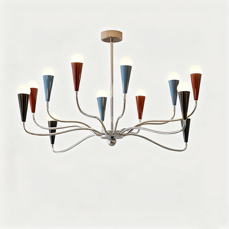 This Motiflow Chandelier is pure mid-century cool. It totally brings back that awesome retro style with the smooth, curved metal arms and those unique, colorful cone shades. The mix of the polished chrome frame and the pops of color—the red, blue-gray, and black—is super fun and stylish.