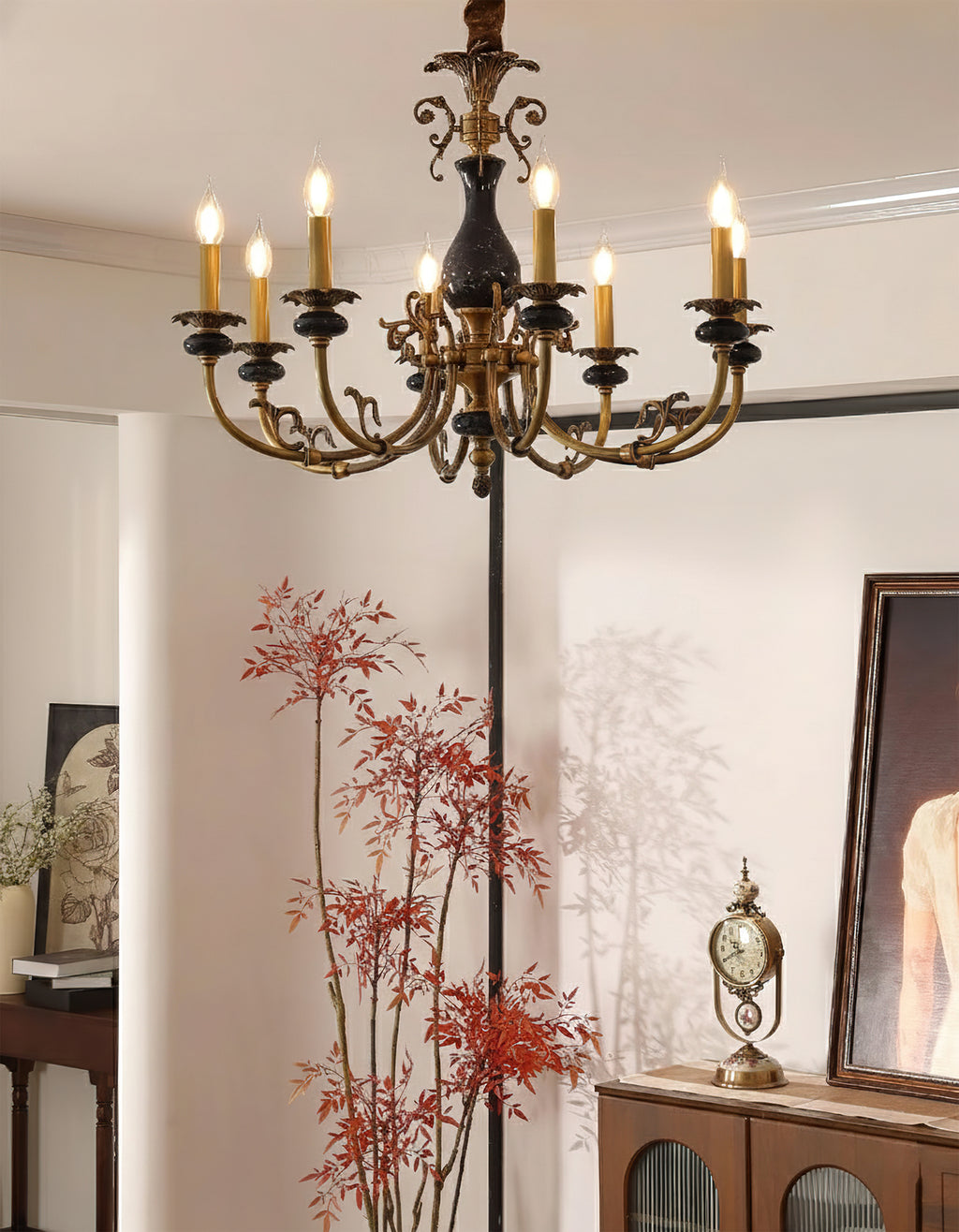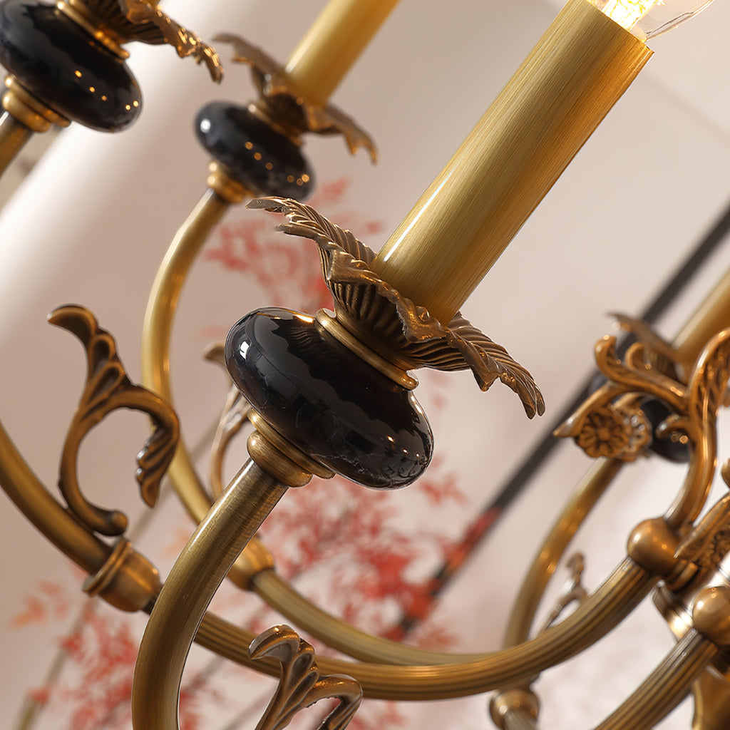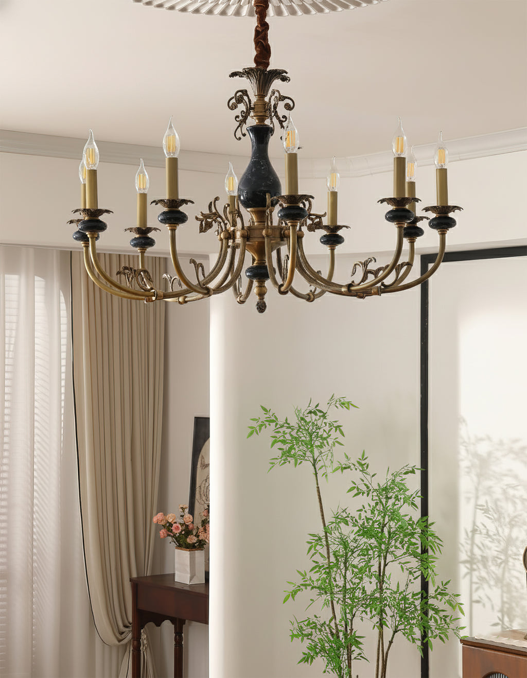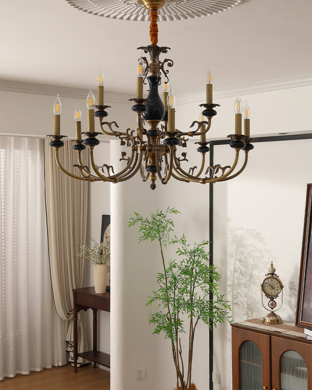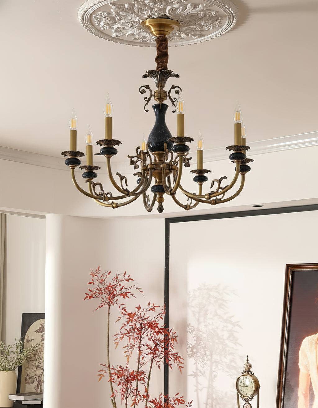 The Ember Chandelier combines a golden brass frame with bold, dark ceramic accents for a look that commands attention. From the ornate scrollwork to the velvet-touch chain cover, every detail is designed to impress.