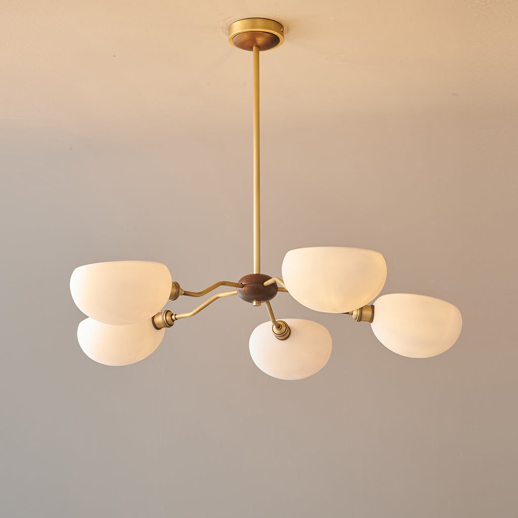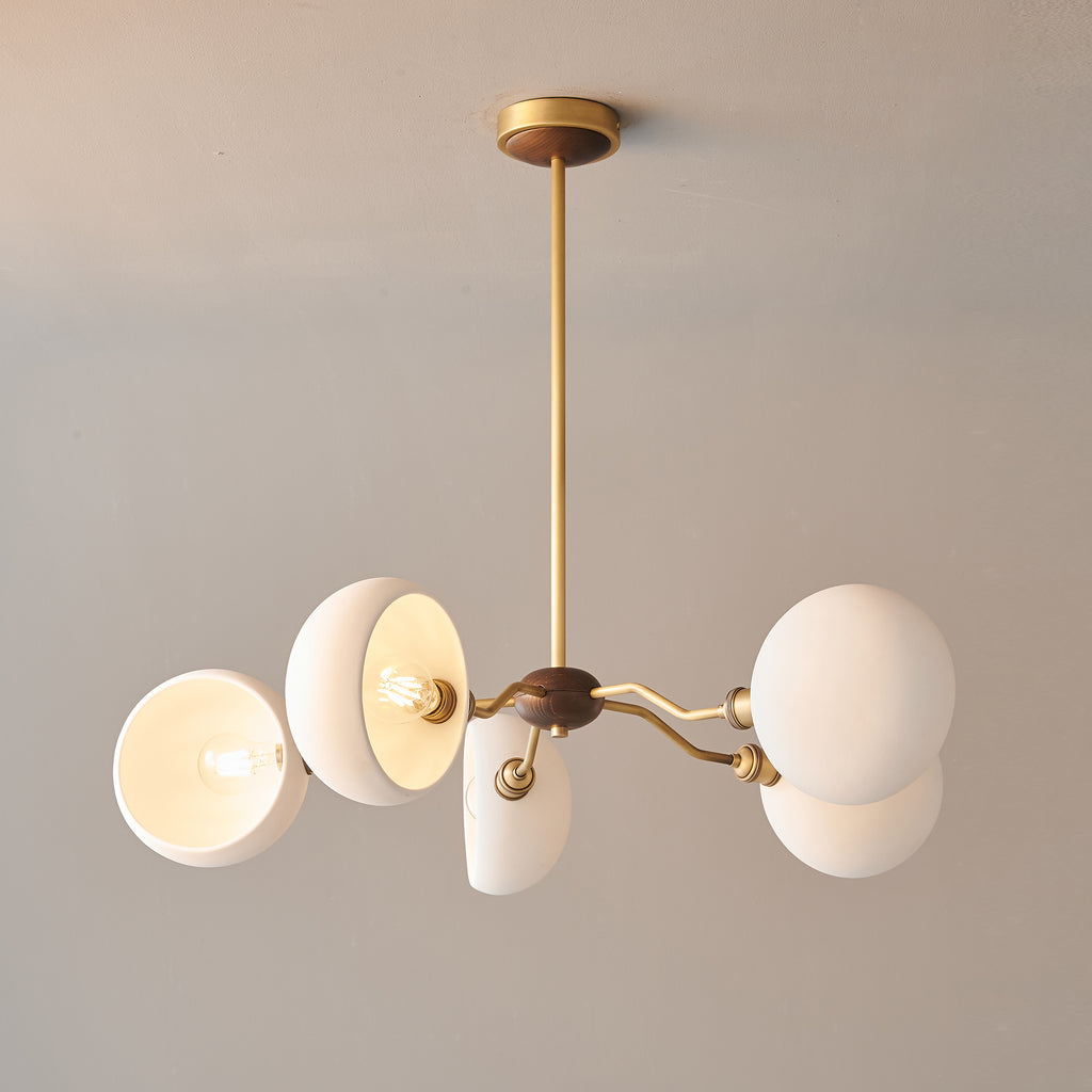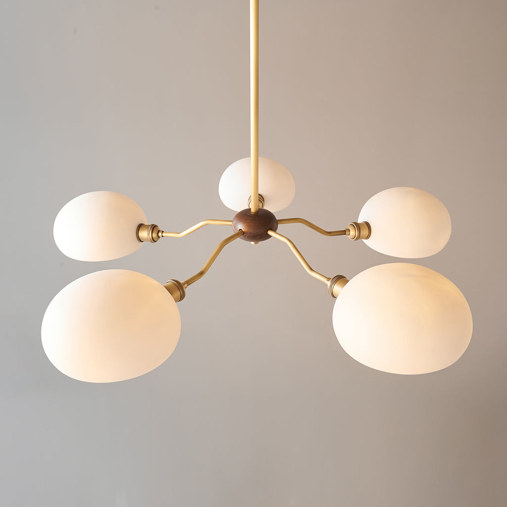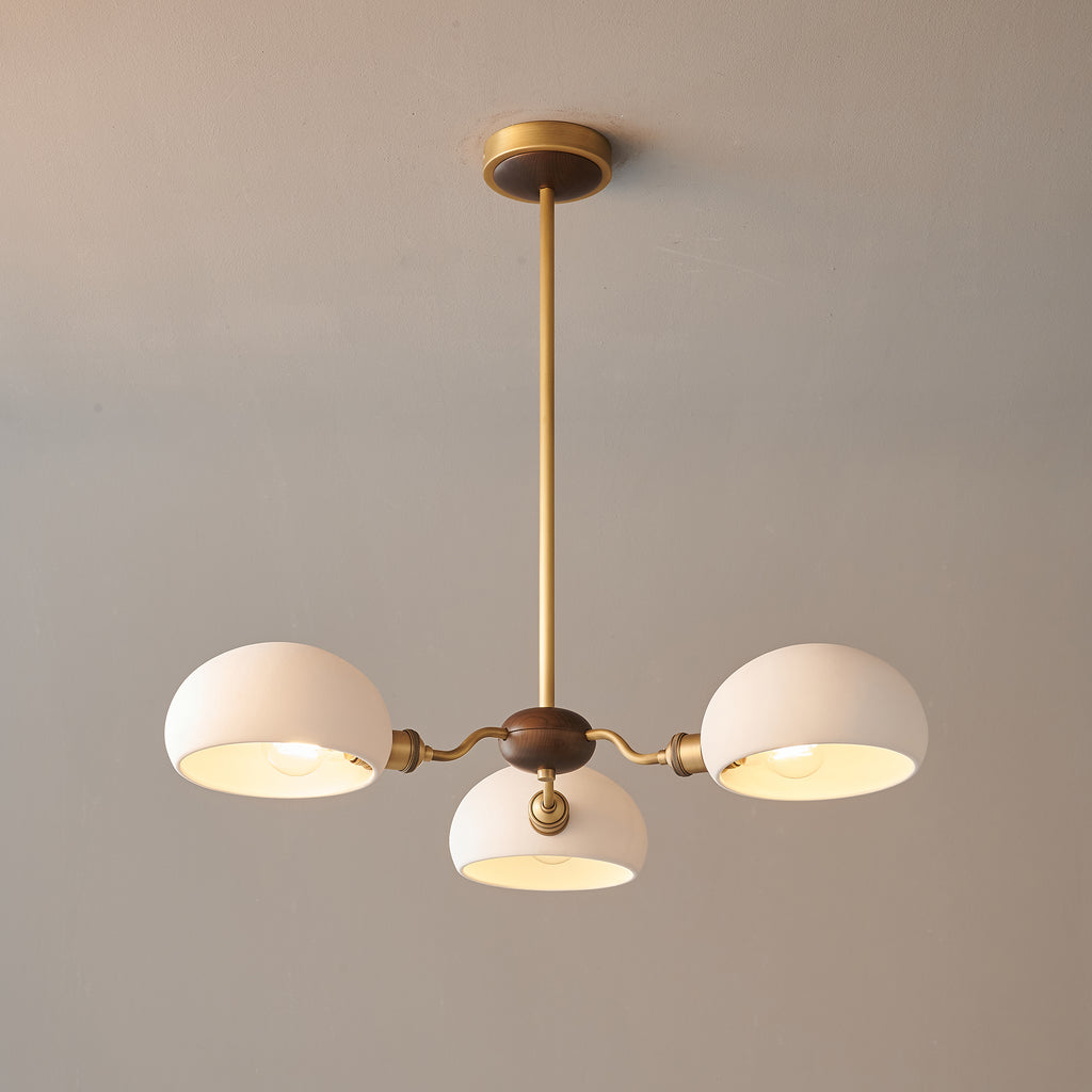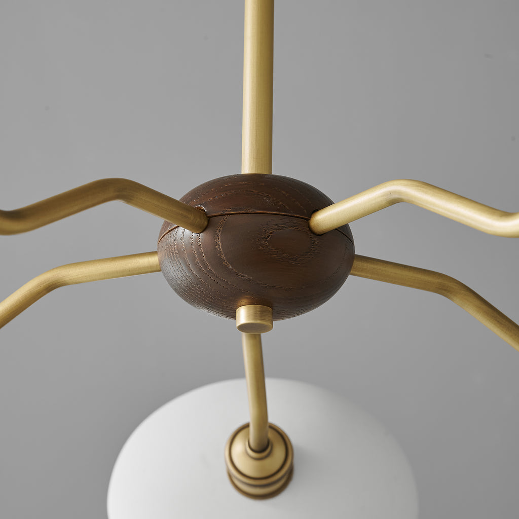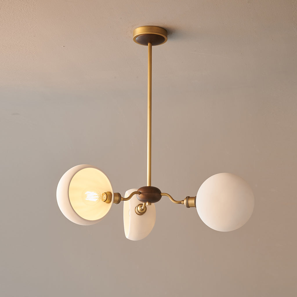 The Miralis Chandelier combines three refined materials to create a statement lighting fixture. Brass elements provide warm metallic accents and durability, while ash wood brings natural grain and organic elegance to the design. Ceramic components add textural contrast and a sophisticated finish. This thoughtfully composed chandelier works as both functional illumination and a curated design piece, suitable for contemporary or transitional interiors seeking understated luxury.