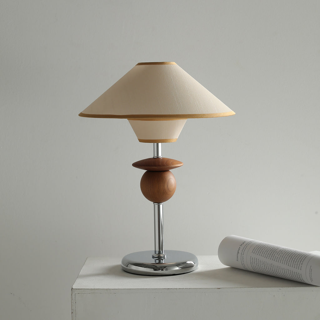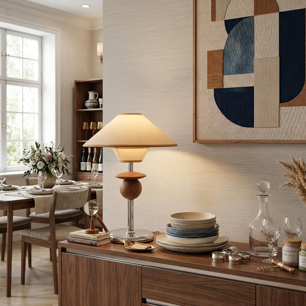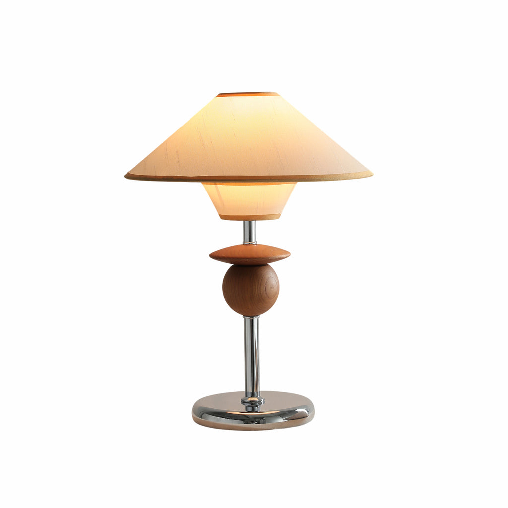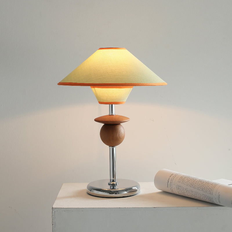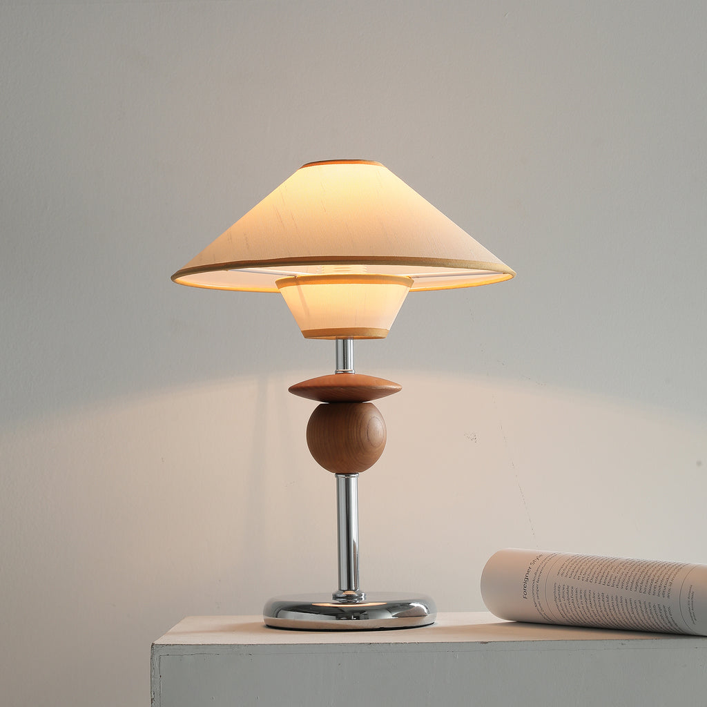 With its elegant and distinctive Mid-Century Modern aesthetic, the Bastian Table Lamp masterfully blends the warmth of fabric with the rustic charm of wood. Its signature double-tiered conical fabric shade not only casts a soft, inviting glow but is also accented by exquisite trim, exuding a sense of refined taste. The lamp's highly sculptural solid wood body—whether featuring fluid tapered lines or playful geometric forms comprising spheres and discs—showcases the beauty of expert craftsmanship. Anchored by a sturdy, modern polished plated base, the Bastian Table Lamp serves as more than just a functional light source; it is a decorative art piece designed to elevate the style of any bedroom or living room while creating a warm, welcoming atmosphere.