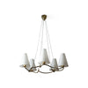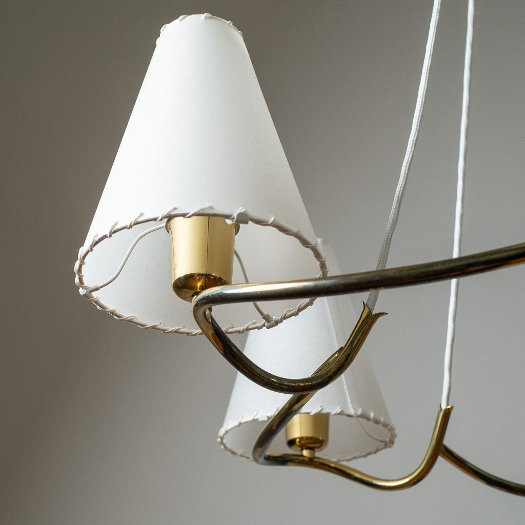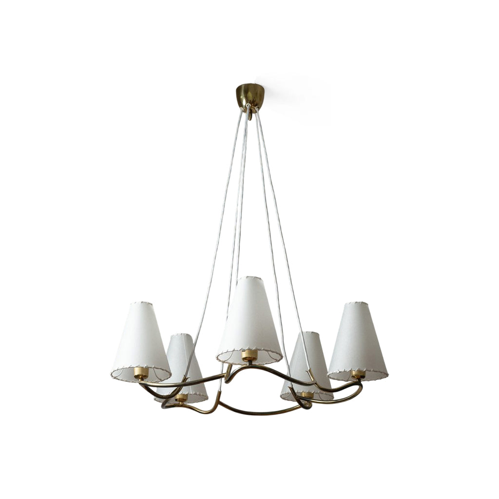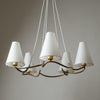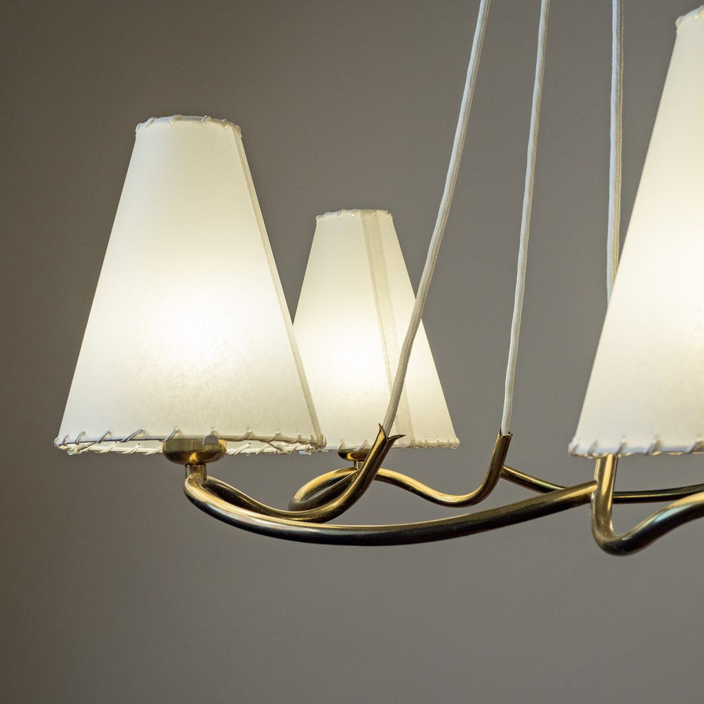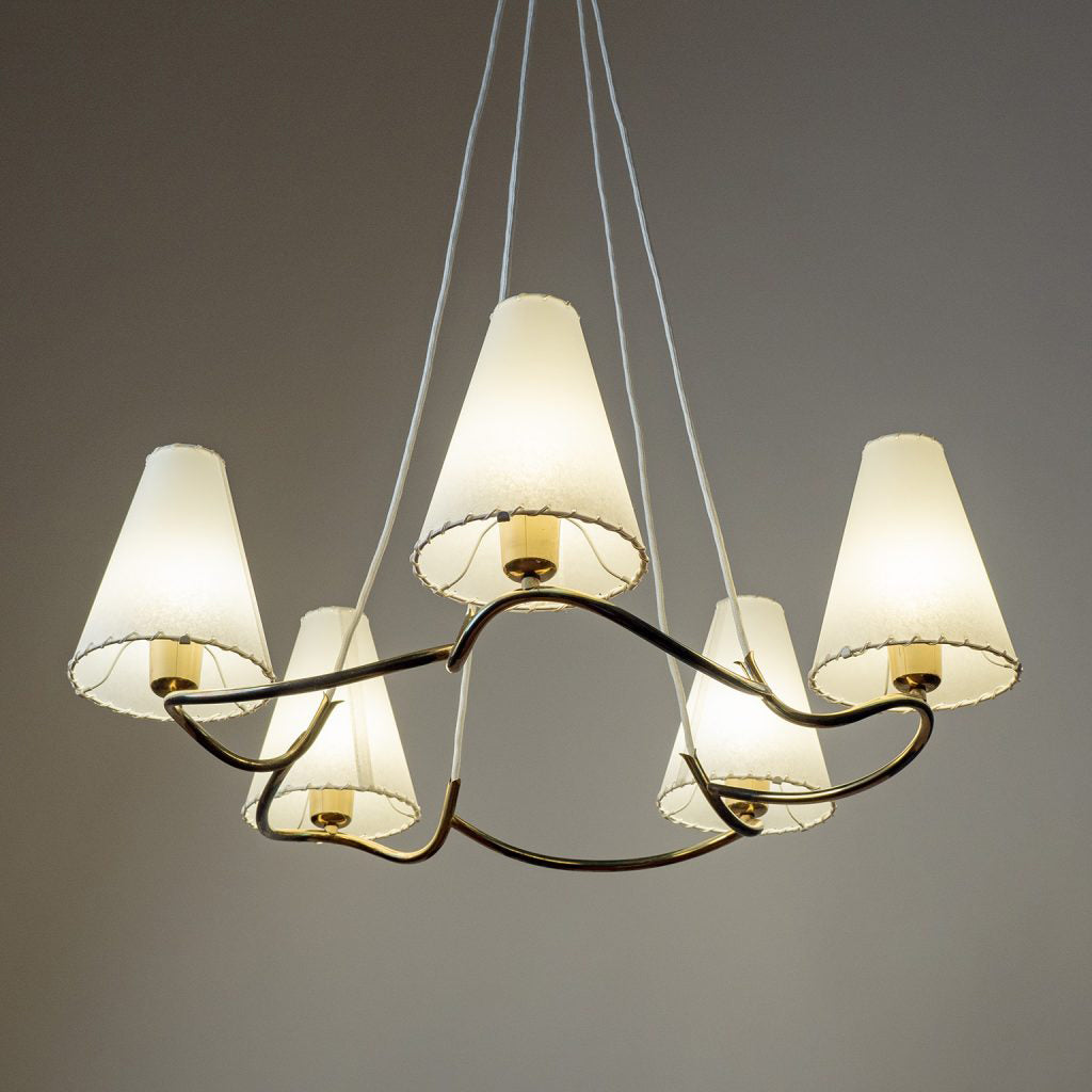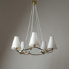 This chandelier is all about bringing a touch of timeless, mid-century charm to your space. The elegant, curved brass frame and soft fabric shades work together to create a warm and sophisticated look. It gives off a beautiful, diffused glow that makes any room feel more welcoming. It's an effortlessly stylish centerpiece for any home.