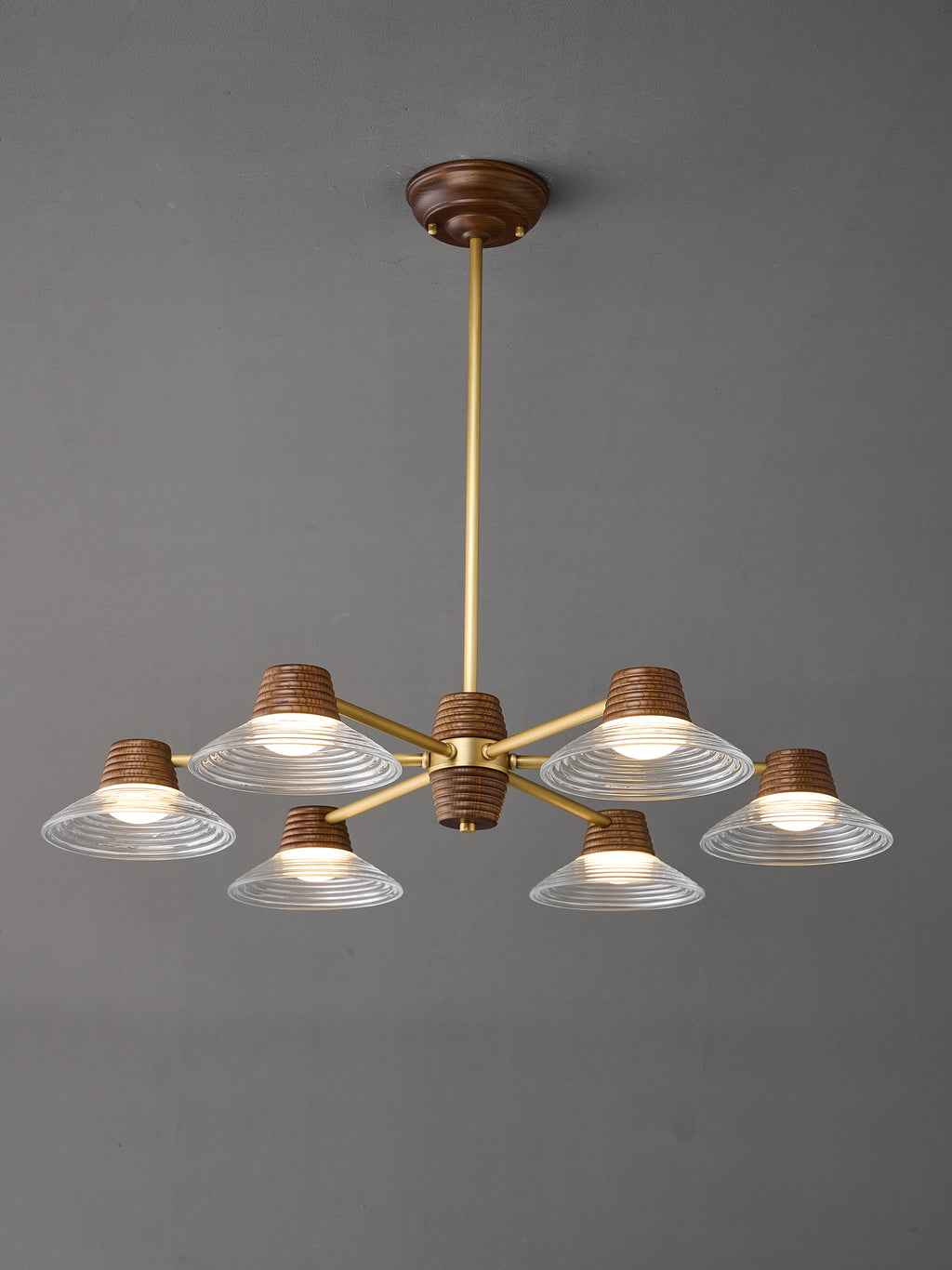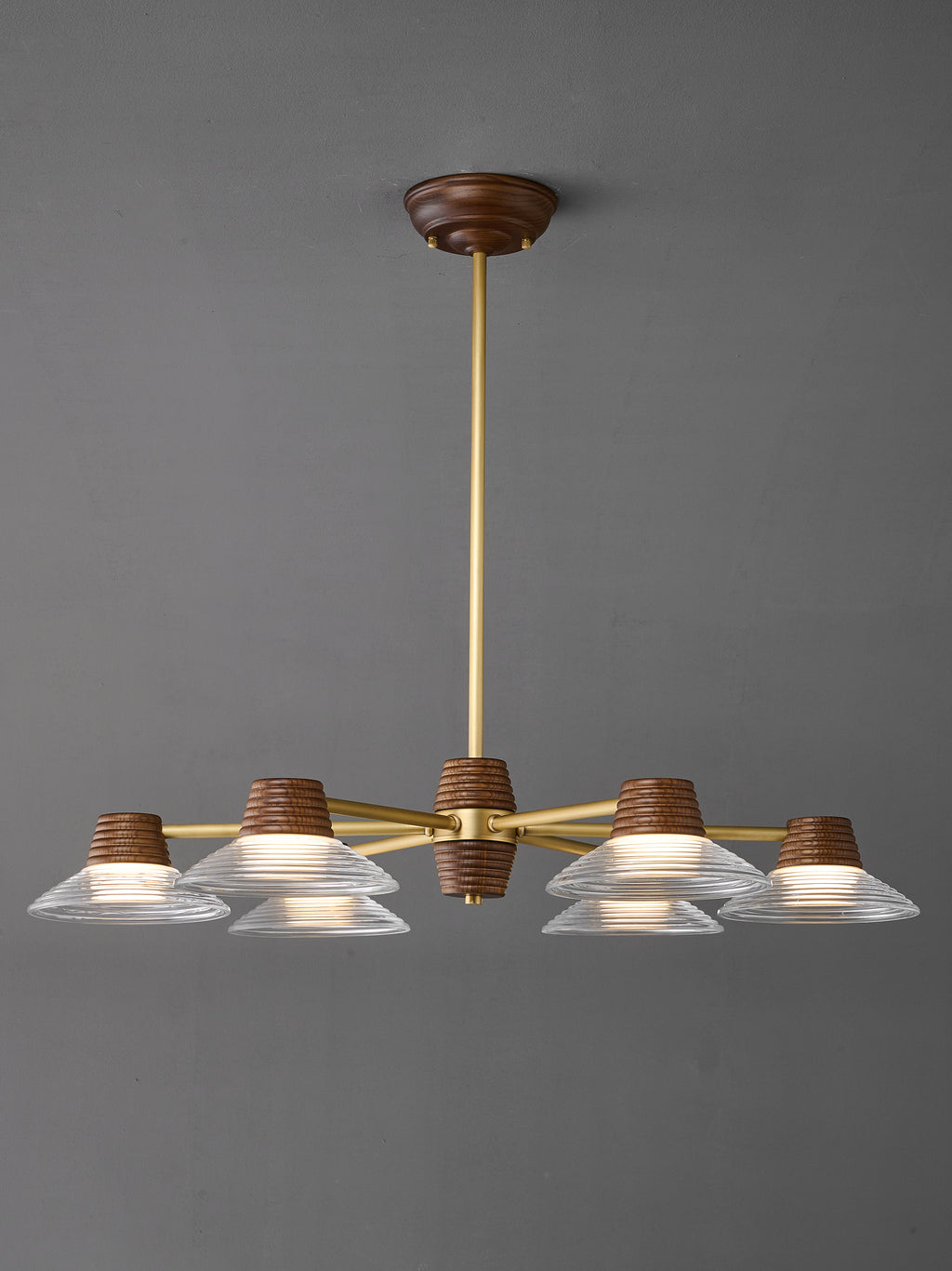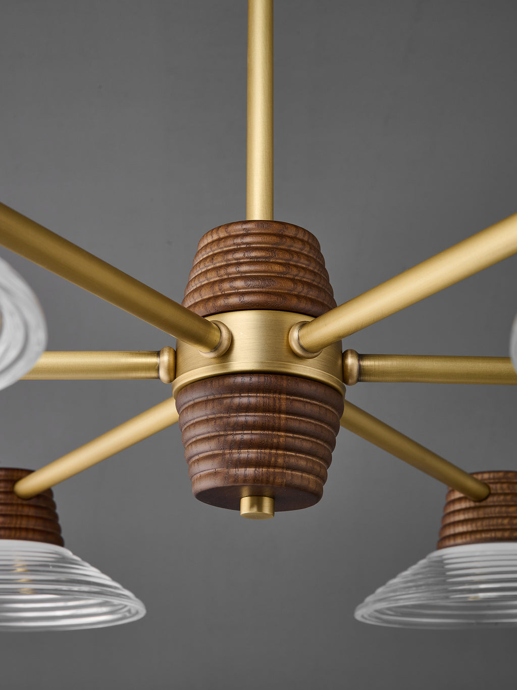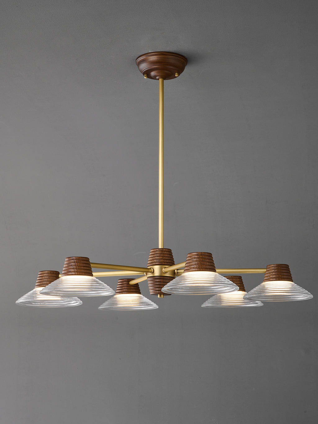 The Lydia Chandelier combines timeless elegance with refined craftsmanship. Featuring warm brass accents paired with natural ash wood and delicate glass elements, this fixture delivers sophisticated ambient lighting for any interior. The harmonious blend of materials creates visual interest while maintaining a cohesive aesthetic. Perfect for dining rooms, entryways, or living spaces seeking a statement piece that balances modern sensibility with classic design principles.